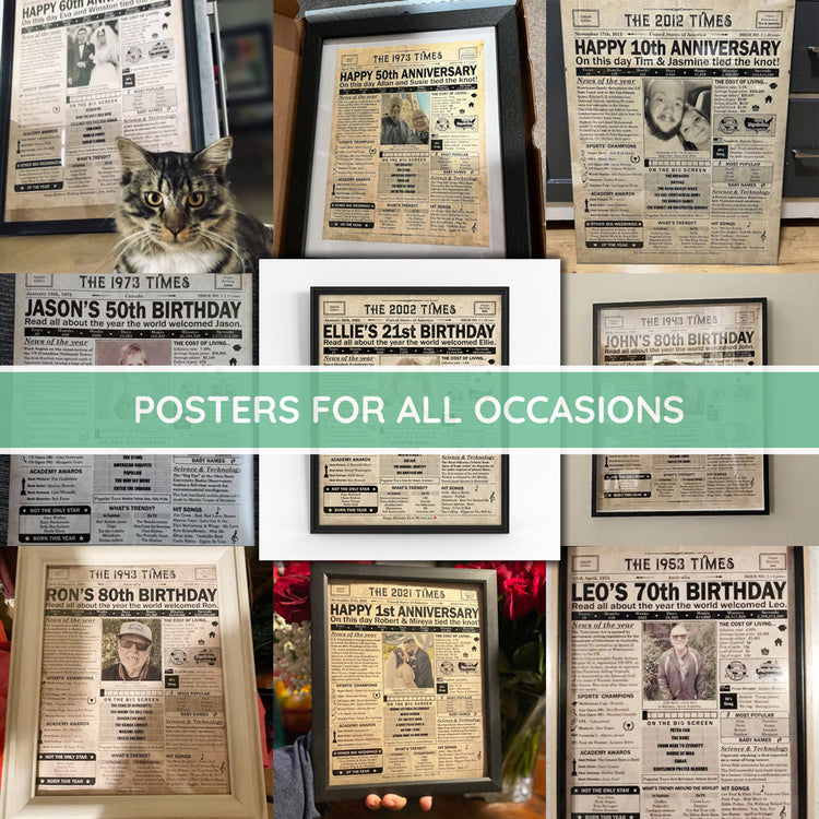 Turn your celebrations into newspaper posters! At GiftsToPrint, we create personalized and visually captivating posters for all special moments. Immortalize your joyous occasions in a unique and engaging format, making memories that last a lifetime.