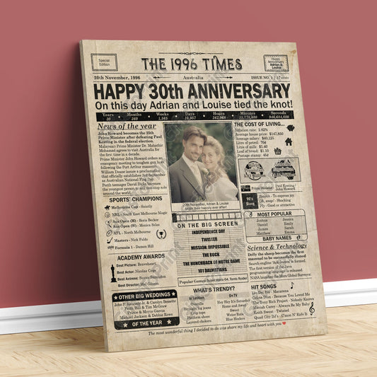 Personalised 30th Anniversary Gift: A Printable AUSTRALIAN Newspaper Poster of 1996