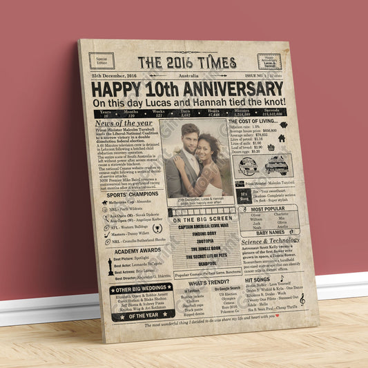 Personalised 10th Anniversary Gift: A Printable AUSTRALIAN Newspaper Poster of 2016
