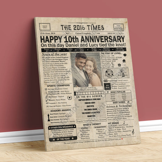 Personalised 10th Anniversary Gift: A Printable UK Newspaper Poster of 2016