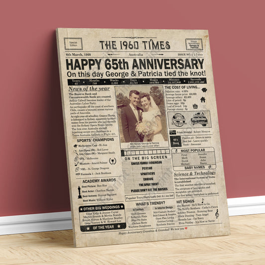 Personalised 65th Anniversary Gift: A Printable AUSTRALIAN Newspaper Poster of 1960