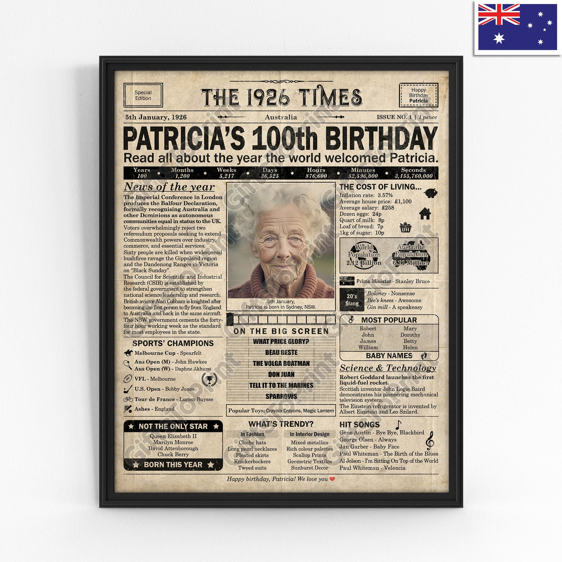 100th Birthday – Australia Version. A printable, personalised birthday poster with news, fun facts, and highlights of what happened in 1926, finished as a realistic, aged newspaper look. Add a photo, name, date of birth, place of birth and even a special message for the bottom of the "newspaper" to give it a personal touch. It makes a beautiful keepsake gift when printed and framed.