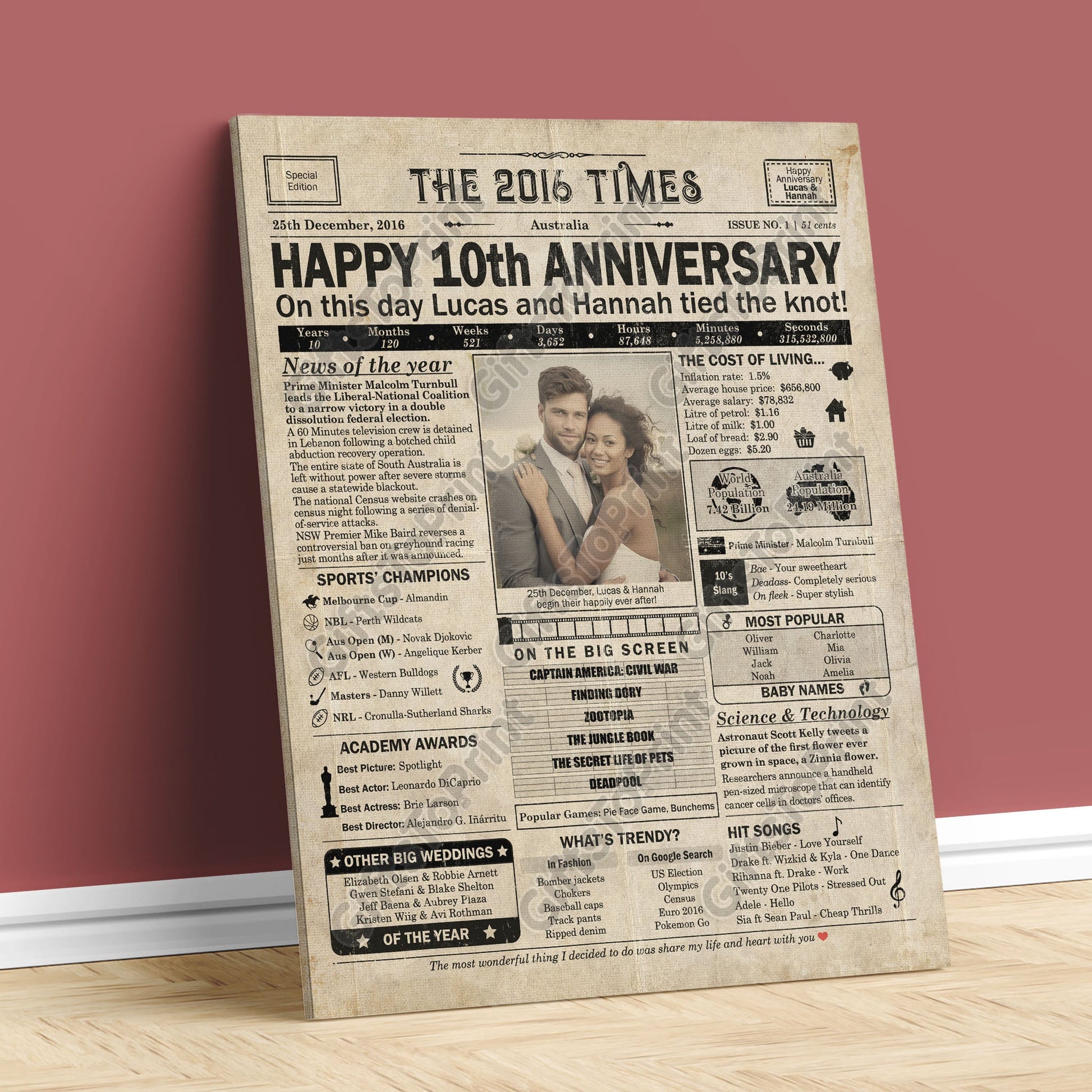 10th Anniversary – Australia Version. A printable, personalised anniversary poster with news, fun facts, and highlights of what happened in 2016, finished as a realistic, aged newspaper look. Add a photo, names, wedding date, and even a special message for the bottom of the "newspaper" to give it a personal touch. It makes a beautiful keepsake gift when printed and framed.