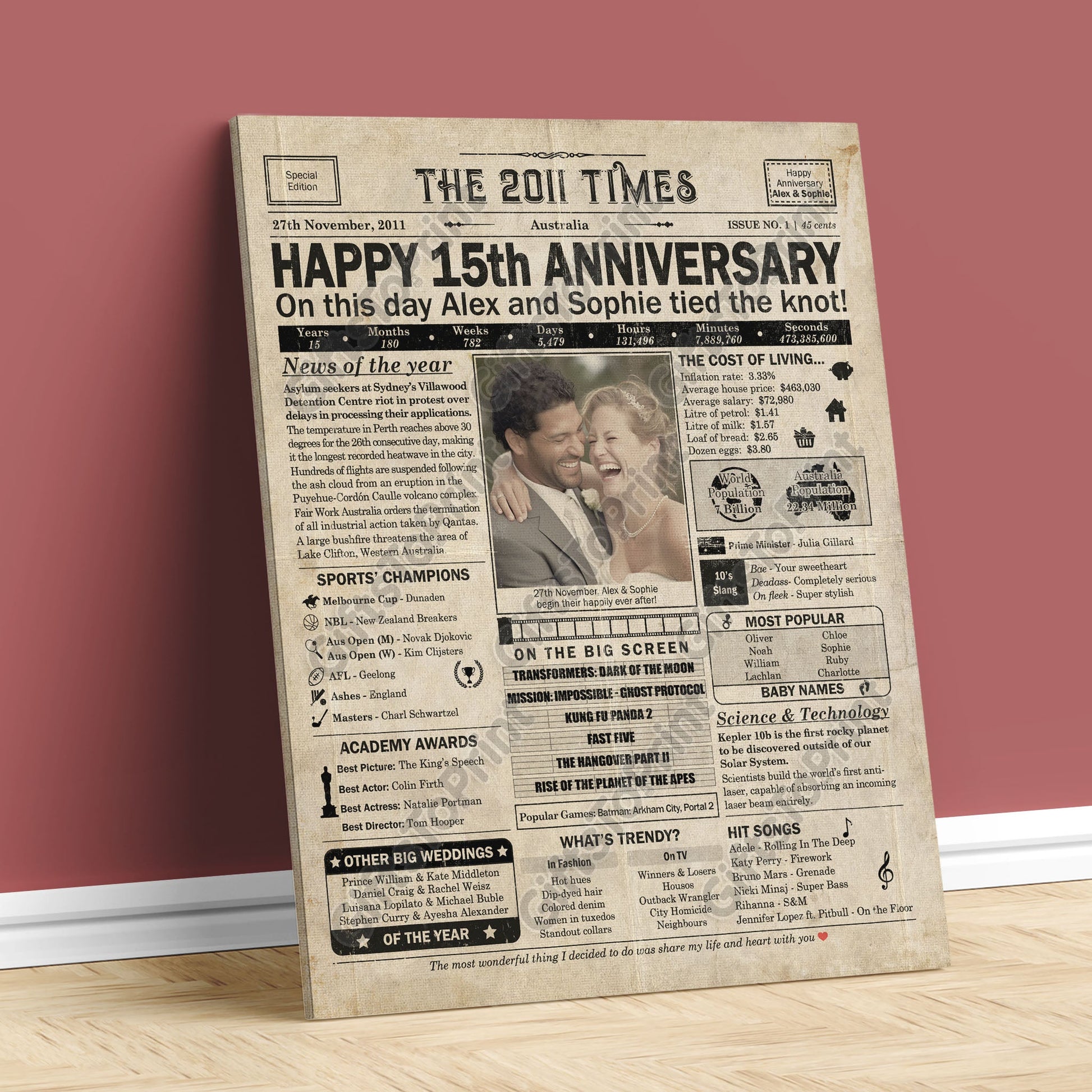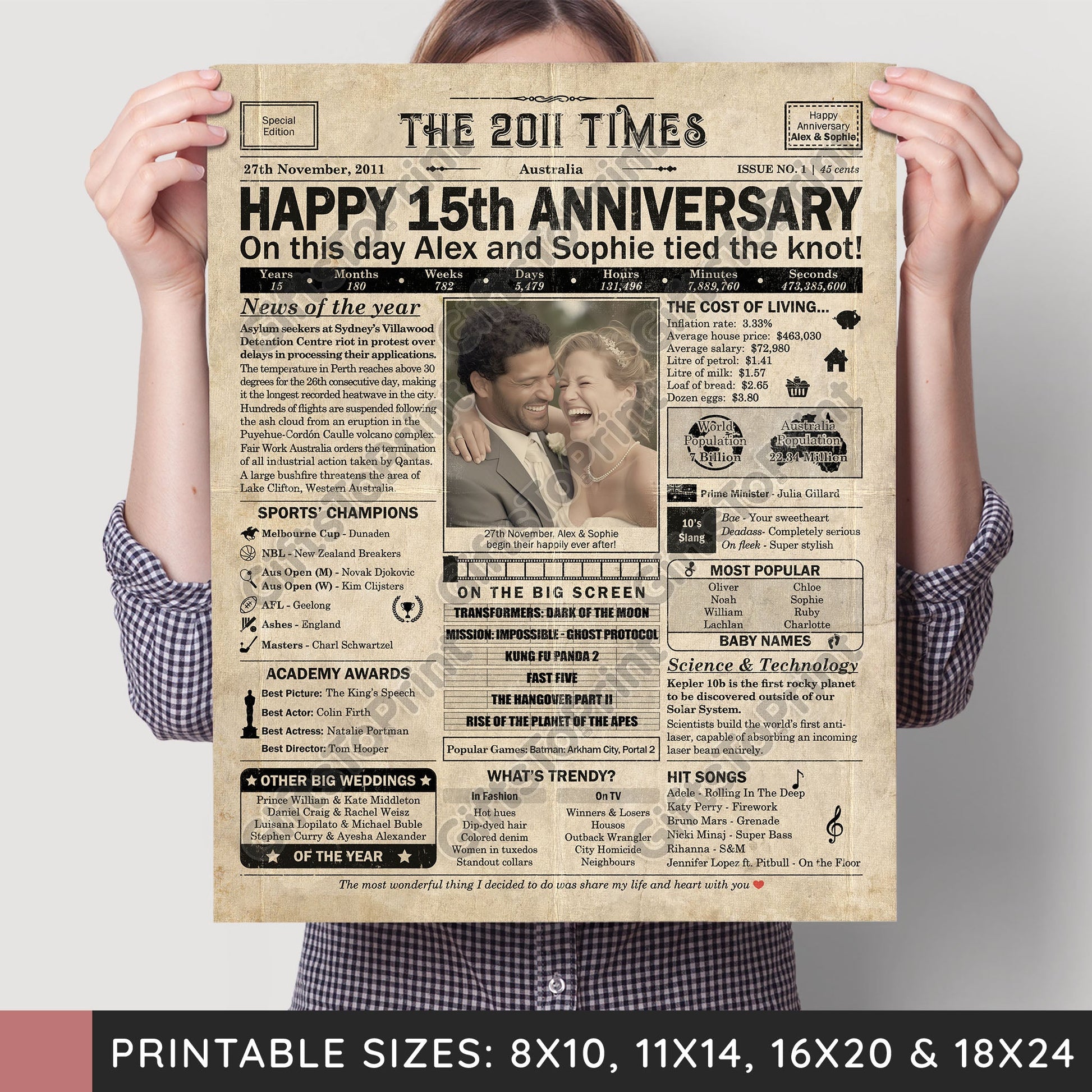 15th Anniversary – Australia Version. A printable, personalised anniversary poster with news, fun facts, and highlights of what happened in 2011, finished as a realistic, aged newspaper look. Add a photo, names, wedding date, and even a special message for the bottom of the "newspaper" to give it a personal touch. It makes a beautiful keepsake gift when printed and framed.