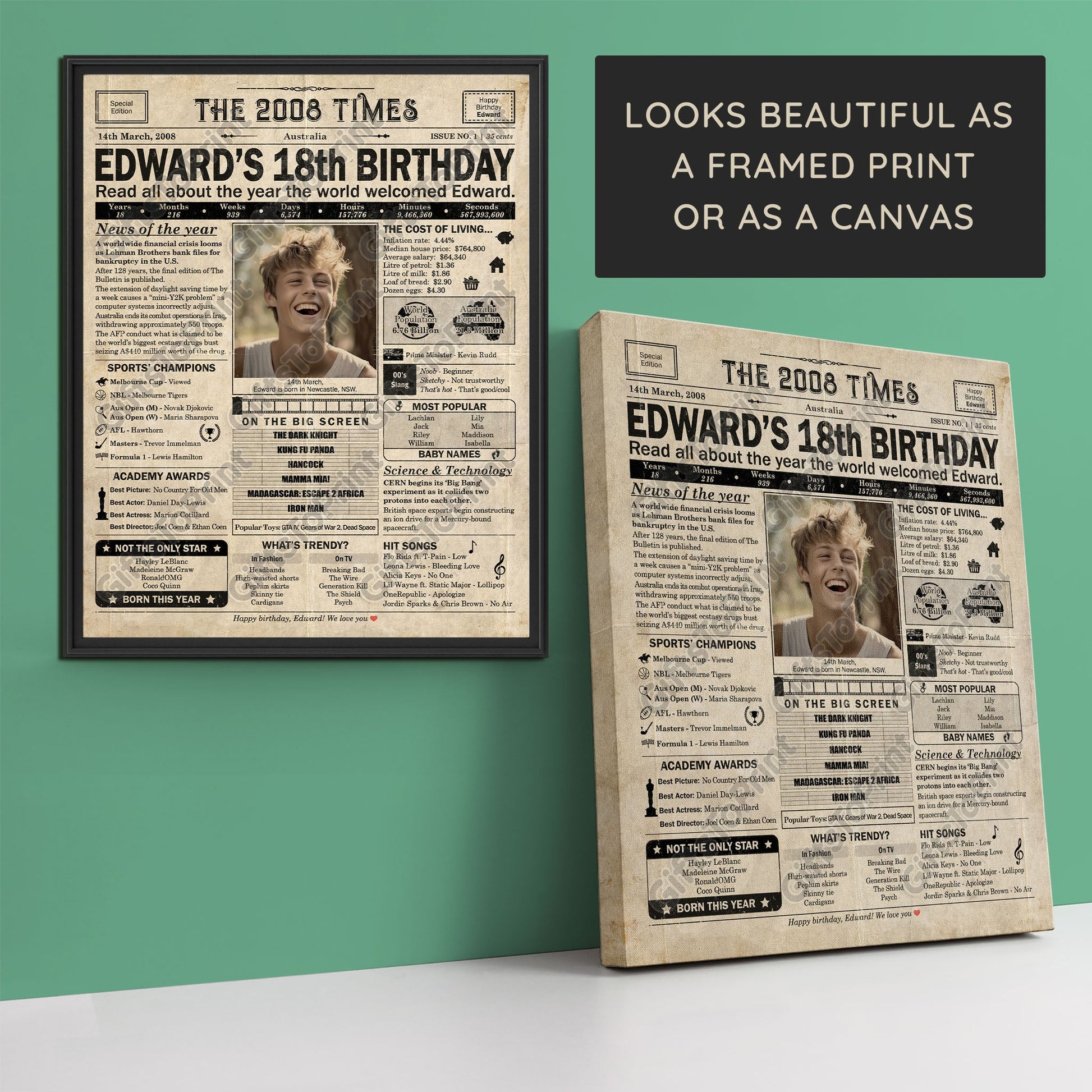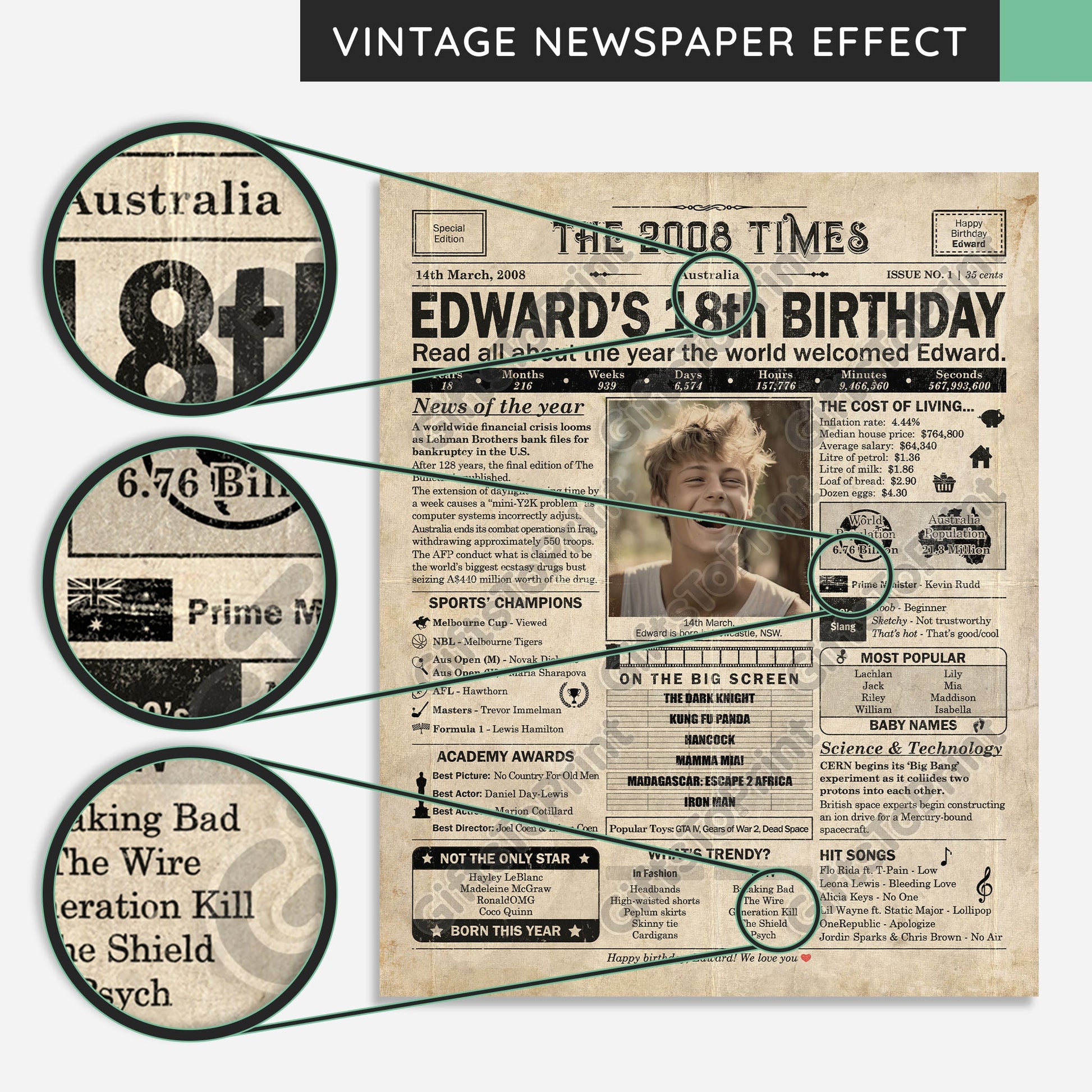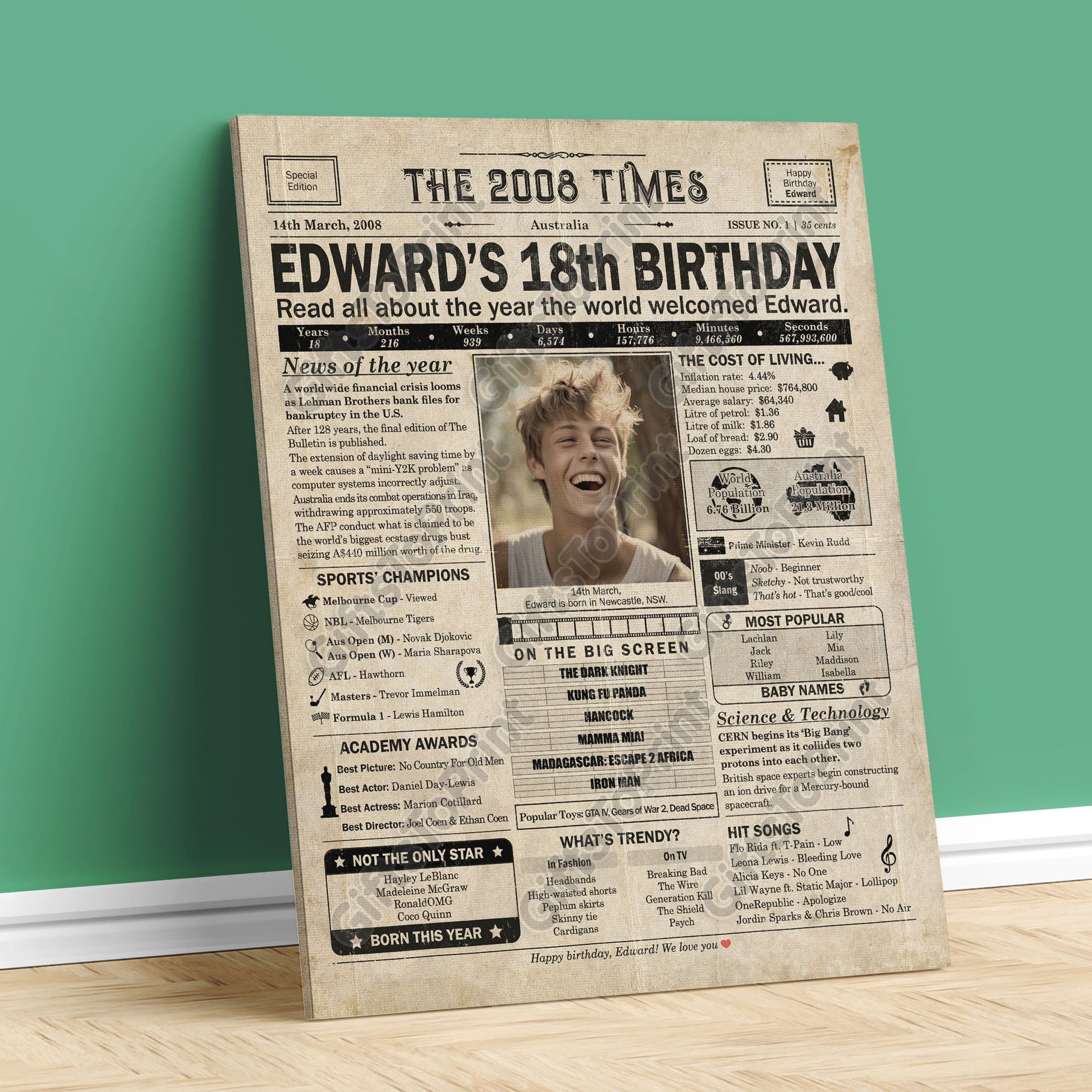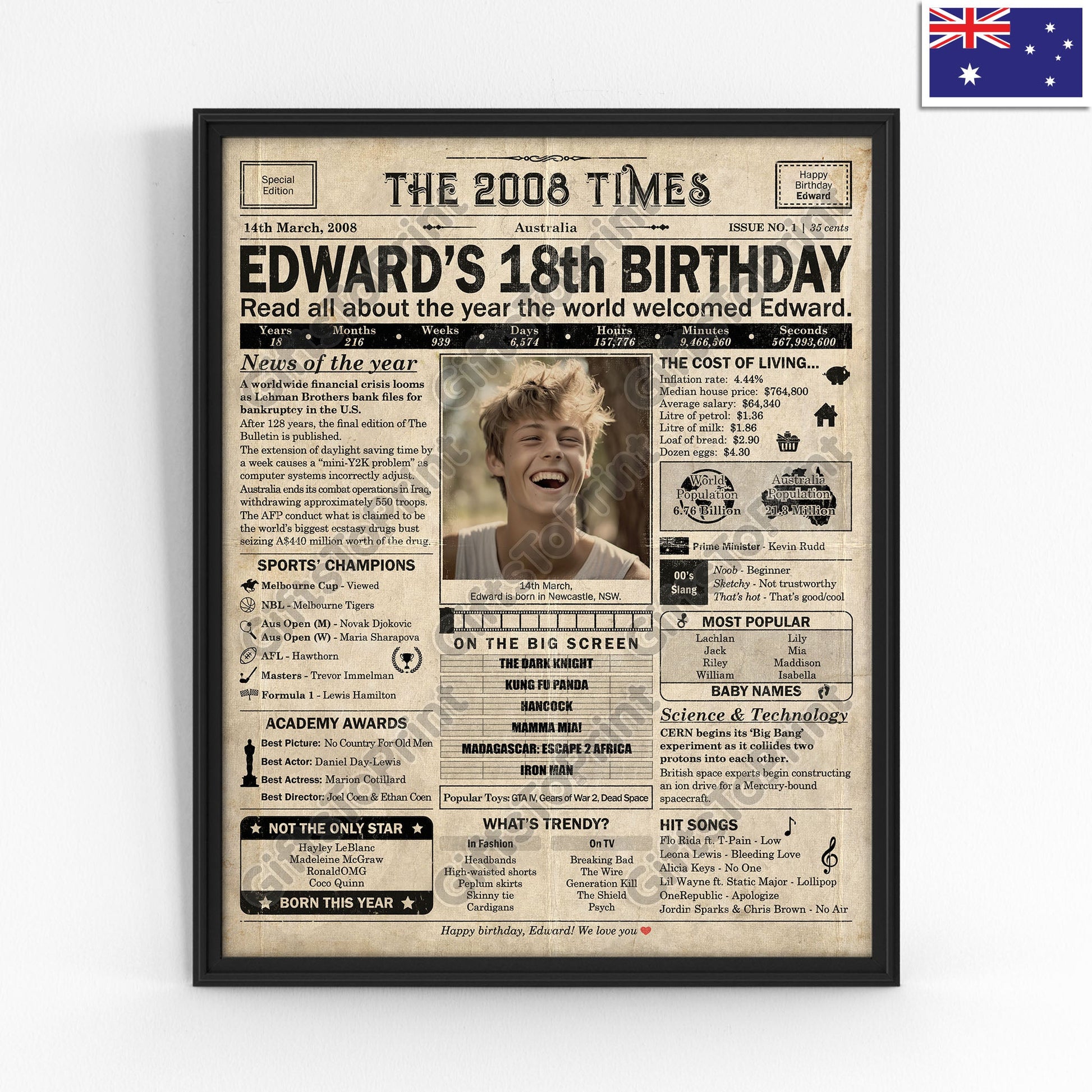 18th Birthday – Australia Version. A printable, personalised birthday poster with news, fun facts, and highlights of what happened in 2008, finished as a realistic, aged newspaper look. Add a photo, name, date of birth, place of birth and even a special message for the bottom of the "newspaper" to give it a personal touch. It makes a beautiful keepsake gift when printed and framed.