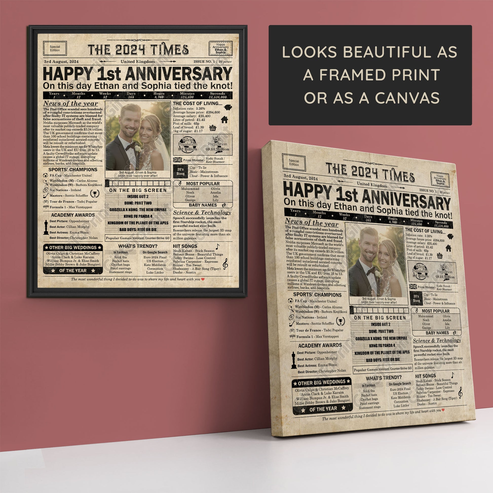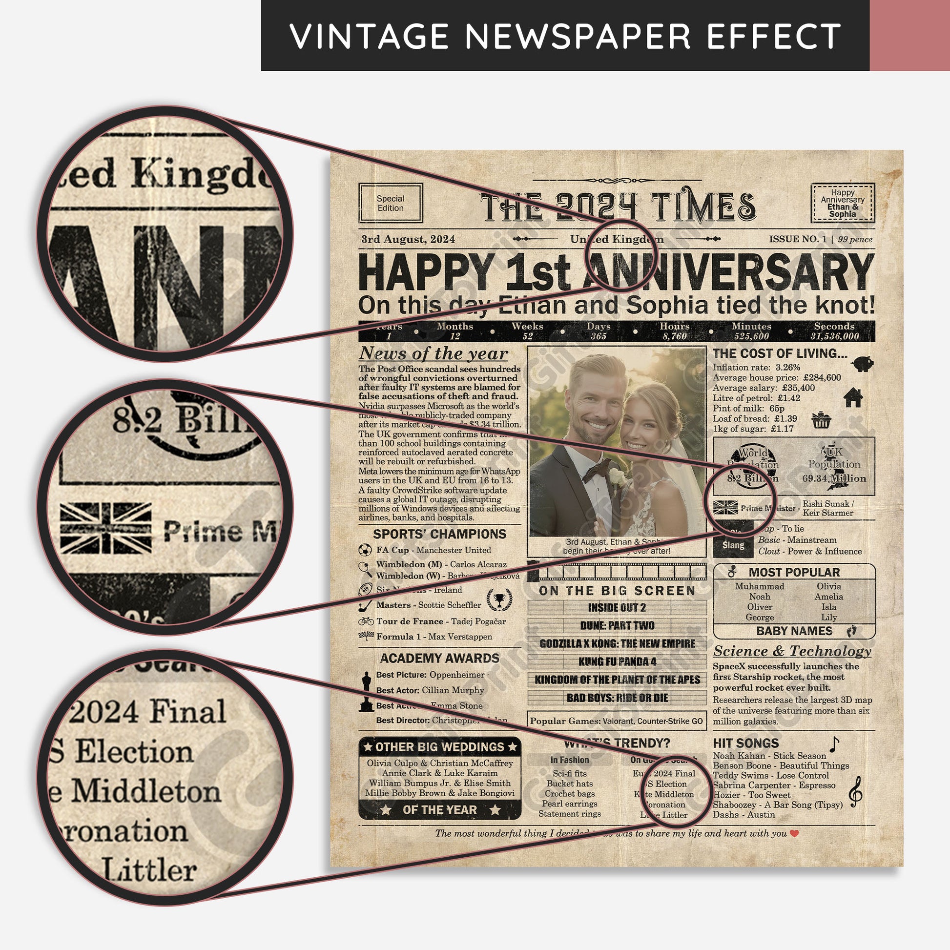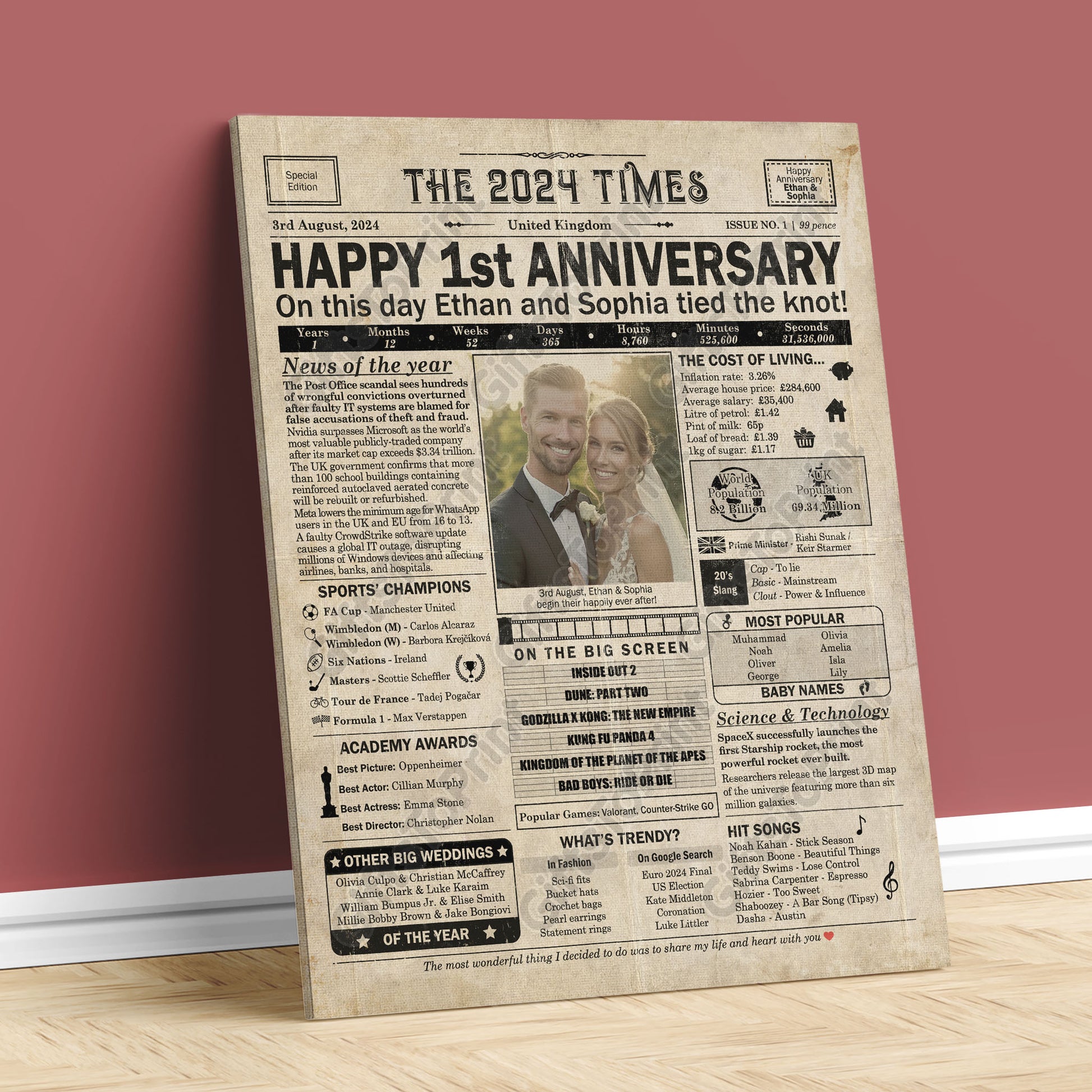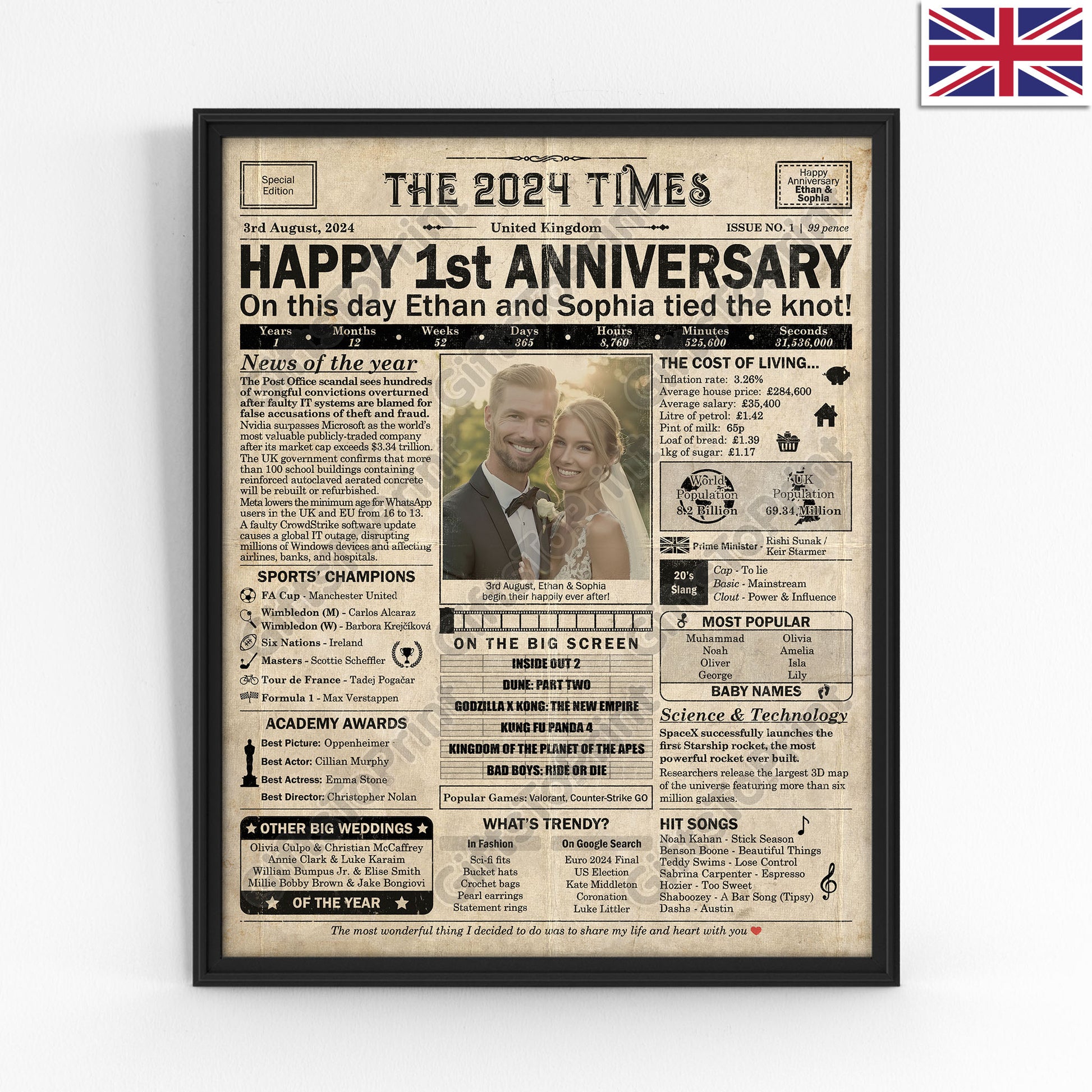 1st Anniversary – UK Version. A printable, personalised anniversary poster with news, fun facts, and highlights of what happened in 2024, finished as a realistic, aged newspaper look. Add a photo, names, wedding date, and even a special message for the bottom of the "newspaper" to give it a personal touch. It makes a beautiful keepsake gift when printed and framed.