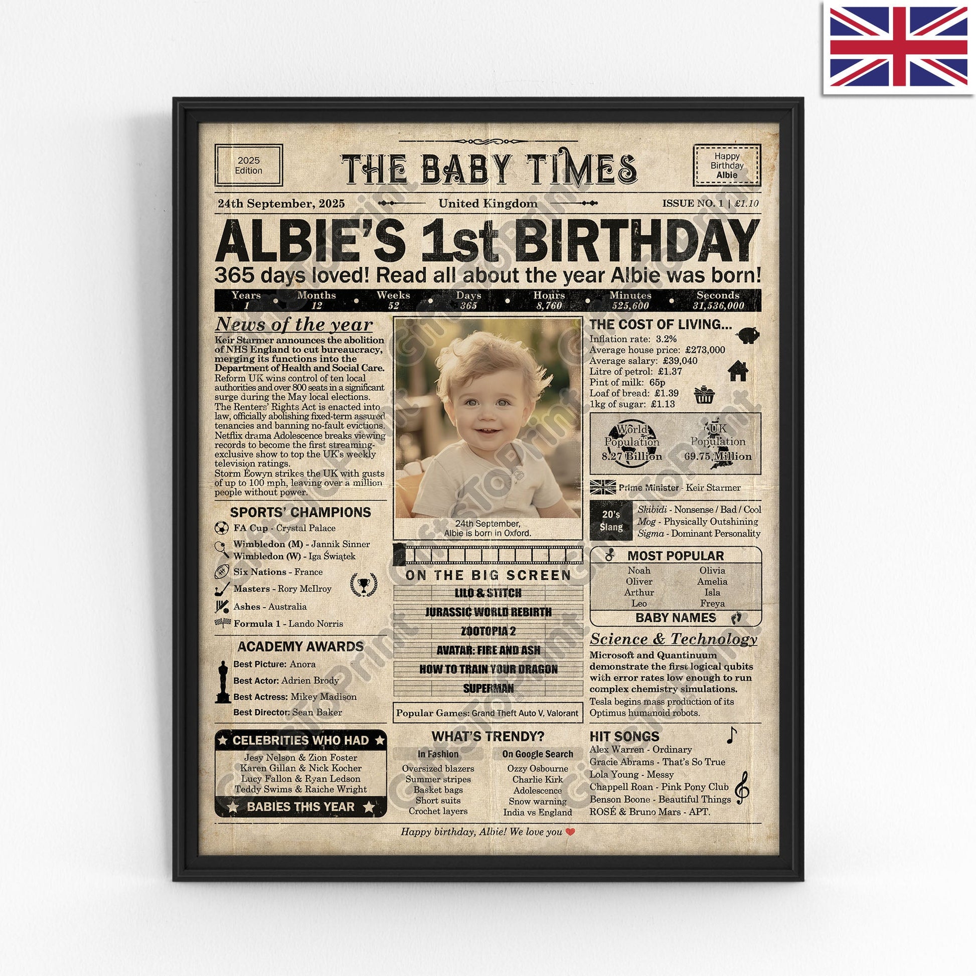 1st Birthday – UK Version. A printable, personalised birthday poster with news, fun facts, and highlights of what happened in 2025, finished as a realistic, aged newspaper look. Add a photo, name, date of birth, place of birth and even a special message for the bottom of the "newspaper" to give it a personal touch. It makes a beautiful keepsake gift when printed and framed.