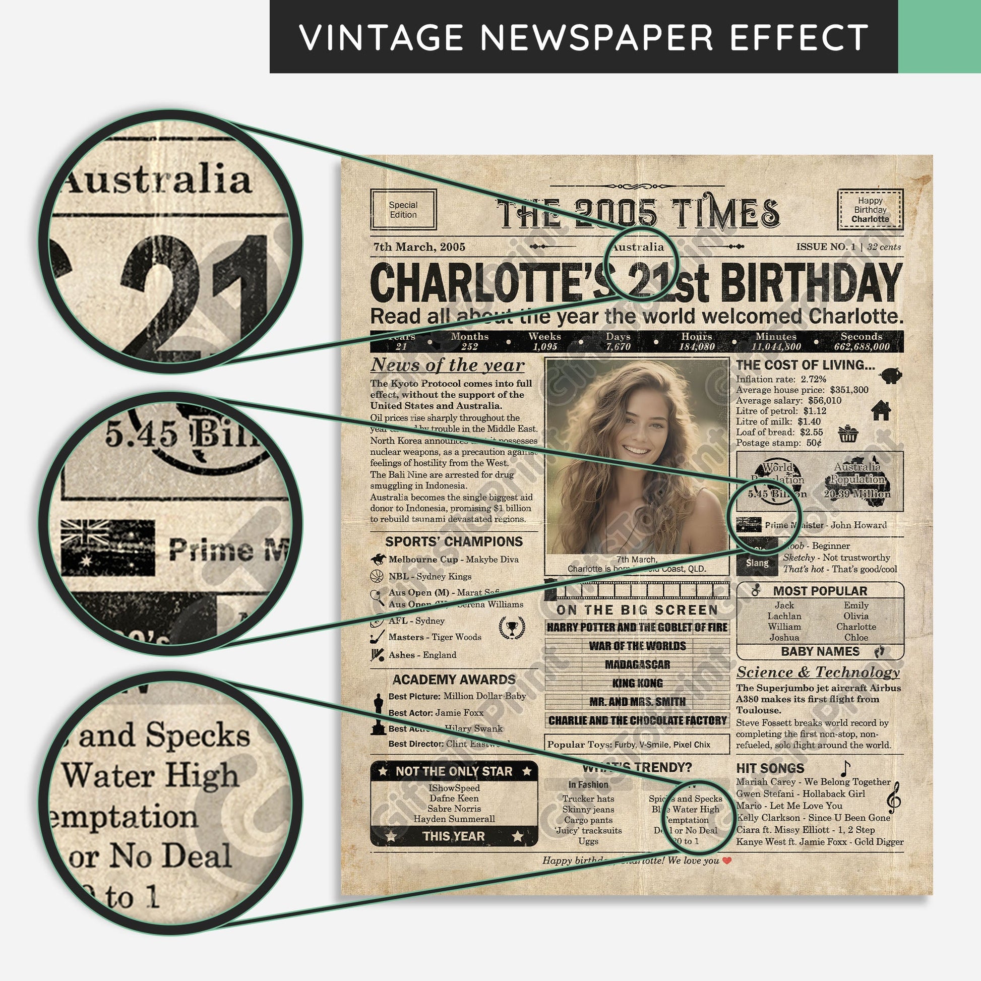 21st Birthday – Australia Version. A printable, personalised birthday poster with news, fun facts, and highlights of what happened in 2005, finished as a realistic, aged newspaper look. Add a photo, name, date of birth, place of birth and even a special message for the bottom of the "newspaper" to give it a personal touch. It makes a beautiful keepsake gift when printed and framed.