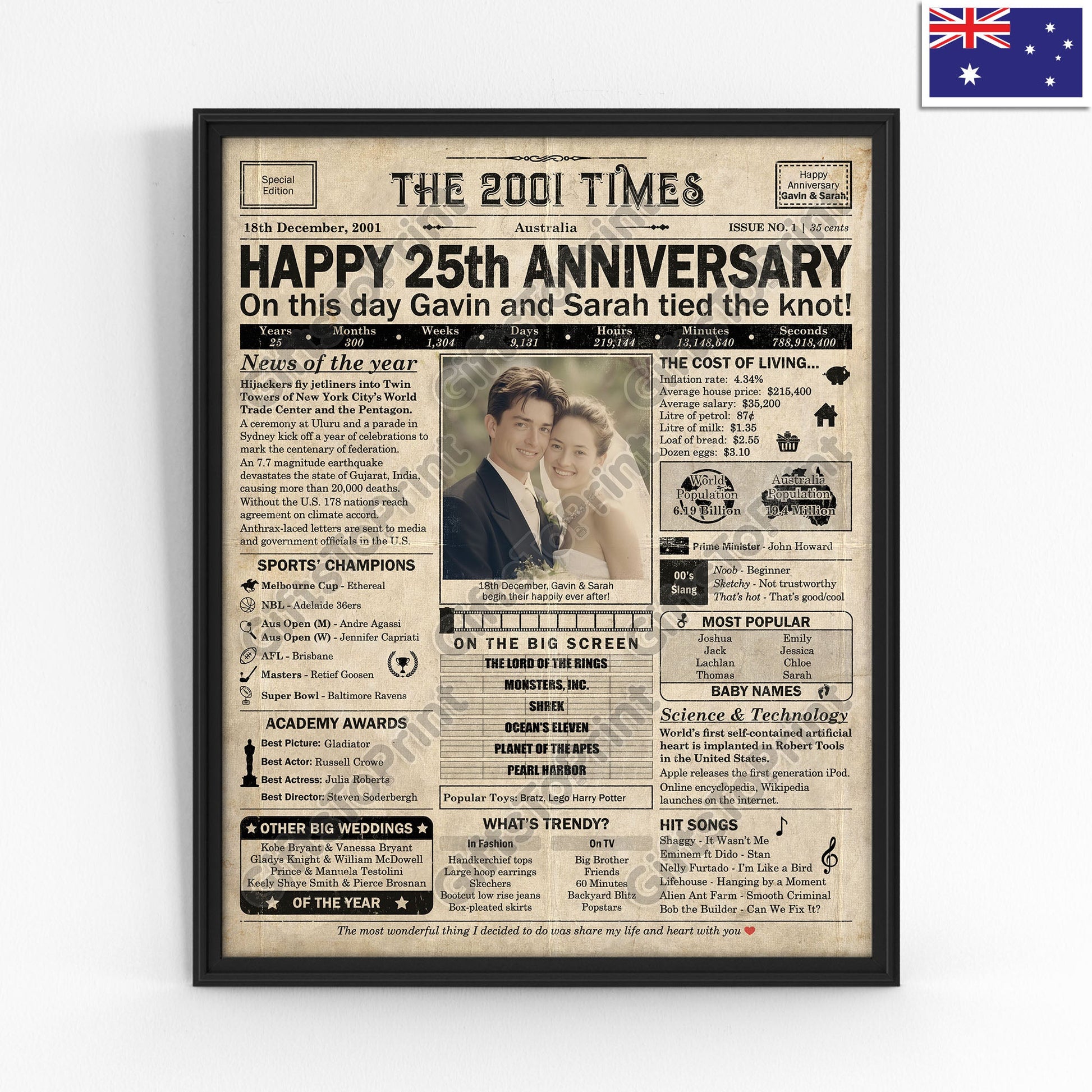25th Anniversary – Australia Version. A printable, personalised anniversary poster with news, fun facts, and highlights of what happened in 2001, finished as a realistic, aged newspaper look. Add a photo, names, wedding date, and even a special message for the bottom of the "newspaper" to give it a personal touch. It makes a beautiful keepsake gift when printed and framed.