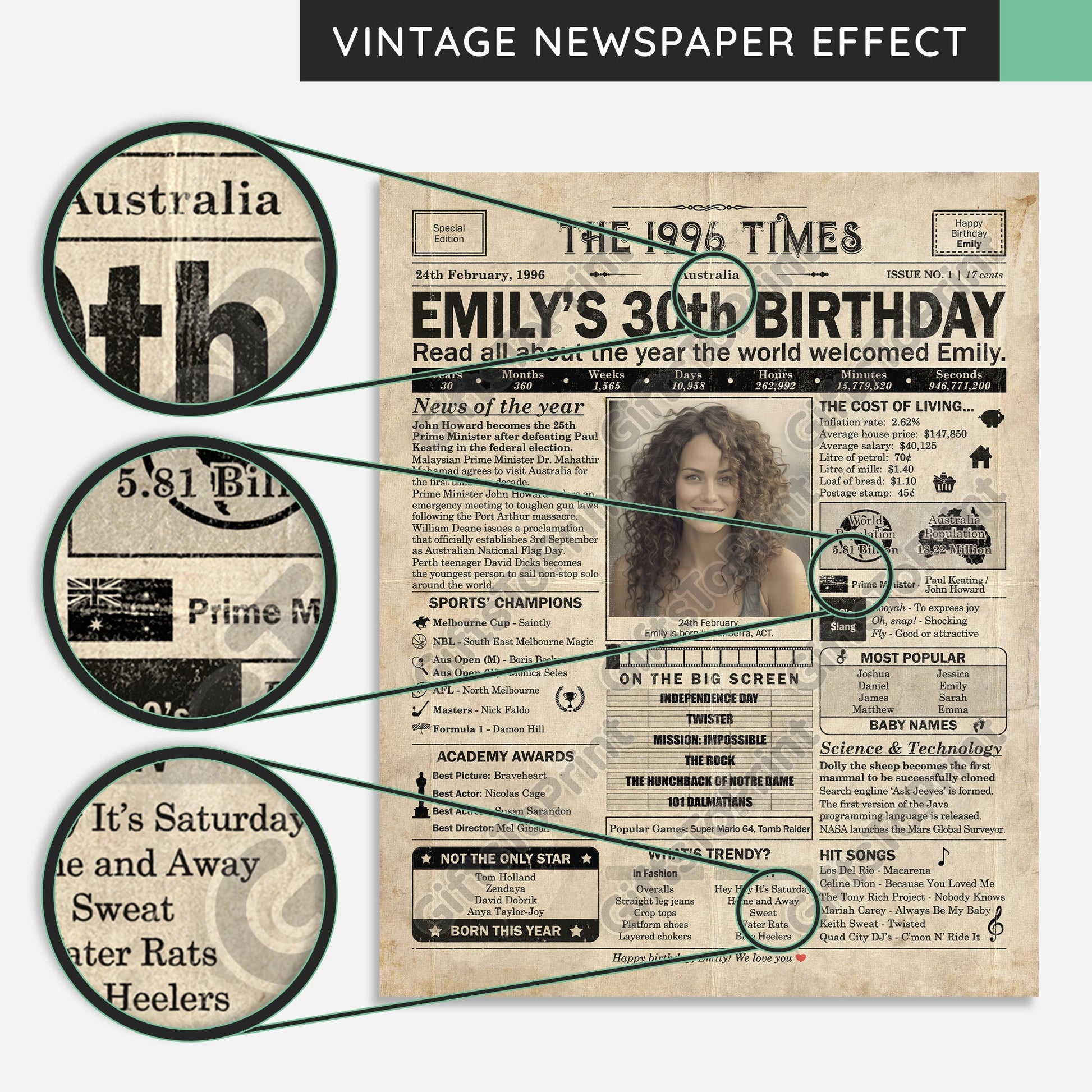 30th Birthday – Australia Version. A printable, personalised birthday poster with news, fun facts, and highlights of what happened in 1996, finished as a realistic, aged newspaper look. Add a photo, name, date of birth, place of birth and even a special message for the bottom of the "newspaper" to give it a personal touch. It makes a beautiful keepsake gift when printed and framed.