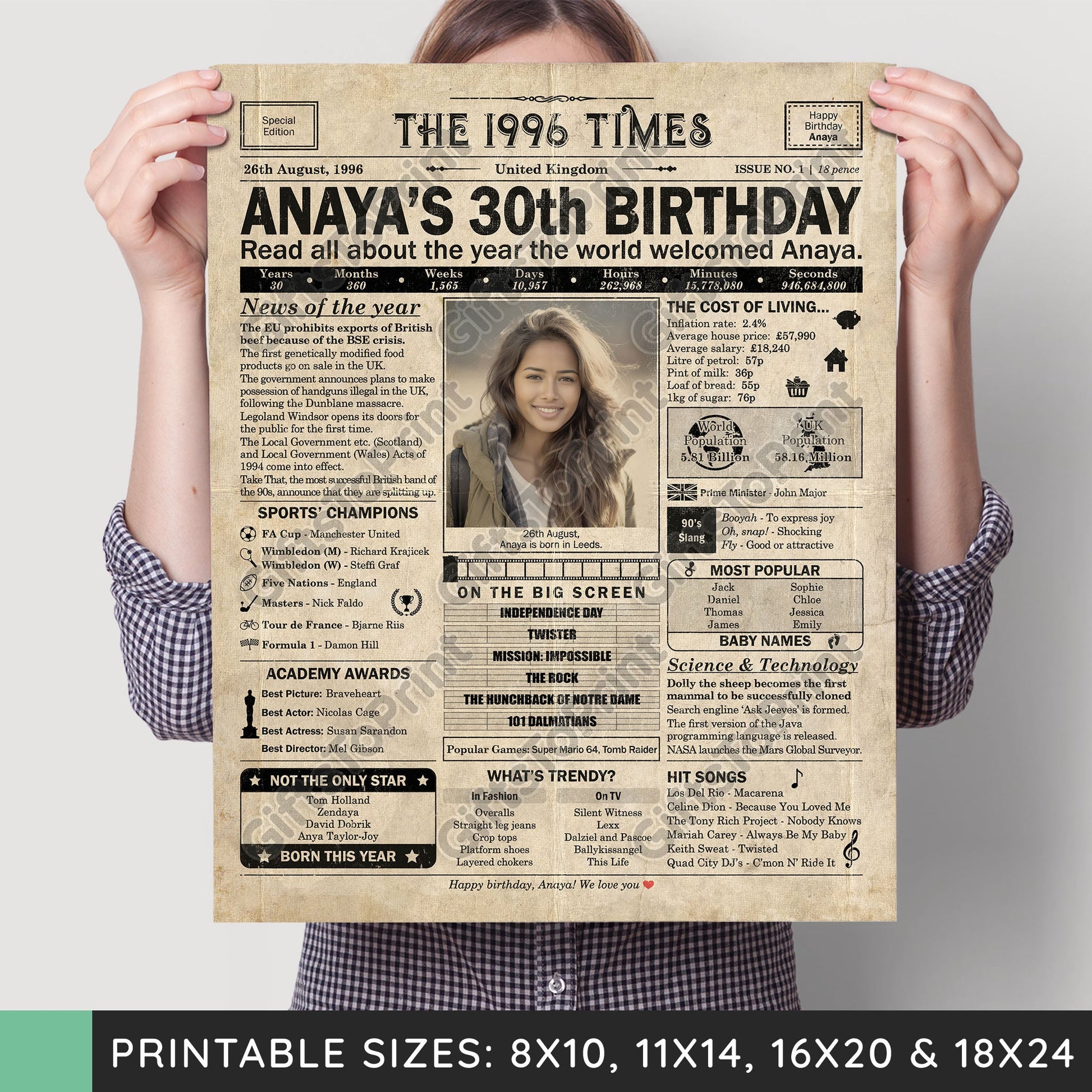 30th Birthday – UK Version. A printable, personalised birthday poster with news, fun facts, and highlights of what happened in 1996, finished as a realistic, aged newspaper look. Add a photo, name, date of birth, place of birth and even a special message for the bottom of the "newspaper" to give it a personal touch. It makes a beautiful keepsake gift when printed and framed.