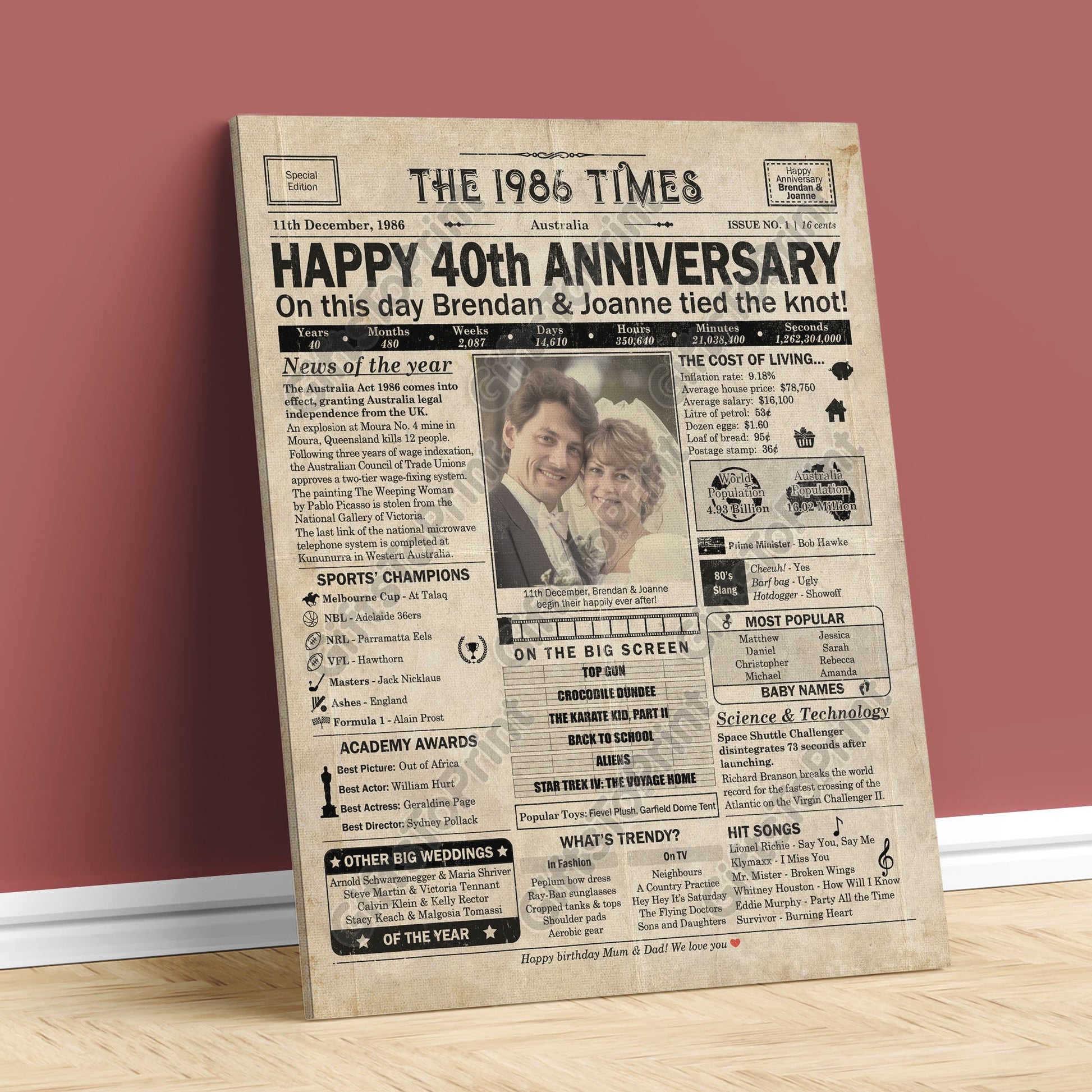 40th Anniversary – Australia Version. A printable, personalised anniversary poster with news, fun facts, and highlights of what happened in 1986, finished as a realistic, aged newspaper look. Add a photo, names, wedding date, and even a special message for the bottom of the "newspaper" to give it a personal touch. It makes a beautiful keepsake gift when printed and framed.