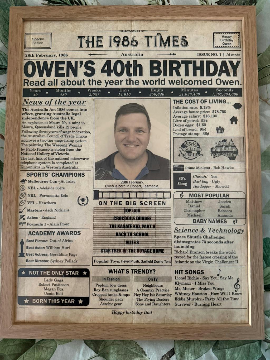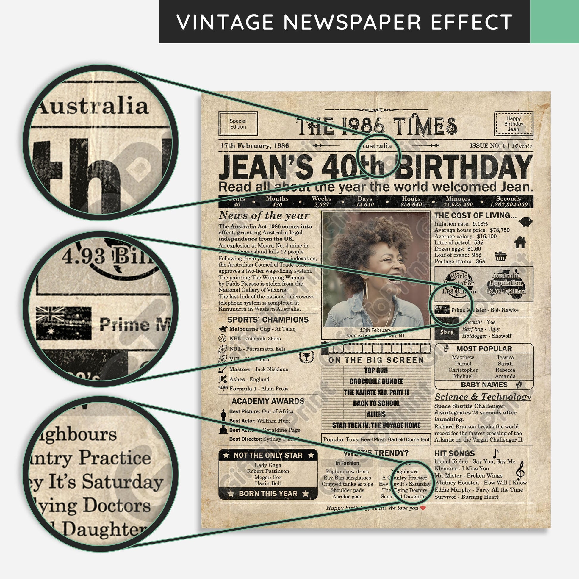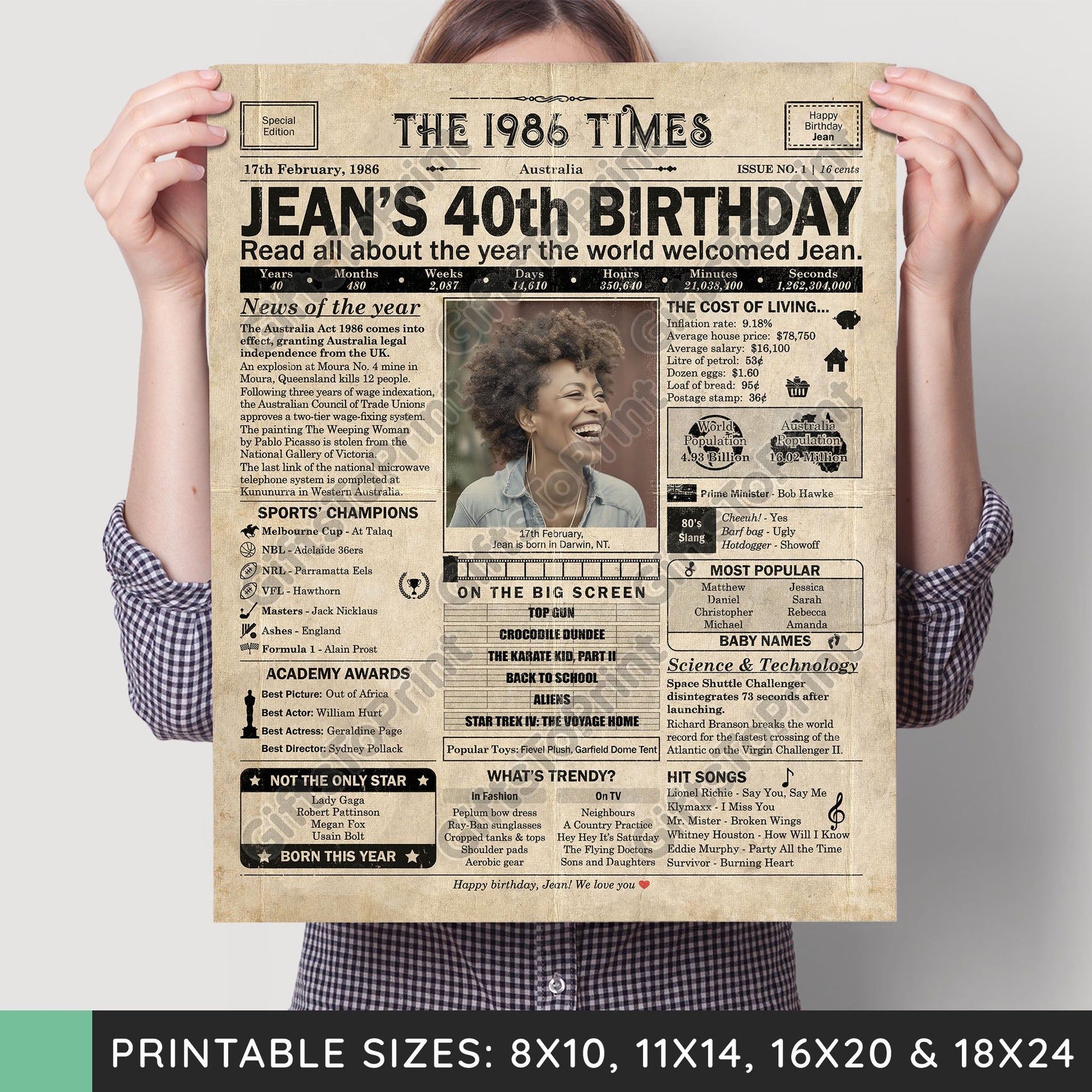 40th Birthday – Australia Version. A printable, personalised birthday poster with news, fun facts, and highlights of what happened in 1986, finished as a realistic, aged newspaper look. Add a photo, name, date of birth, place of birth and even a special message for the bottom of the "newspaper" to give it a personal touch. It makes a beautiful keepsake gift when printed and framed.