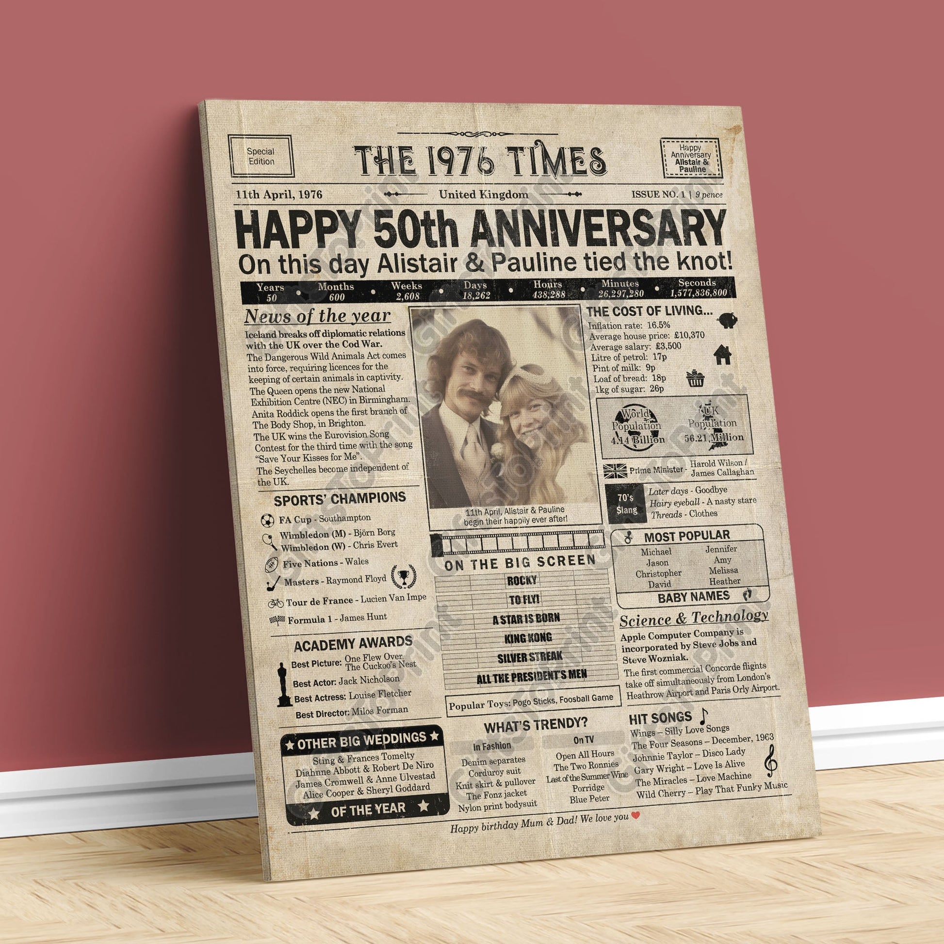 50th Anniversary – UK Version. A printable, personalised anniversary poster with news, fun facts, and highlights of what happened in 1976, finished as a realistic, aged newspaper look. Add a photo, names, wedding date, and even a special message for the bottom of the "newspaper" to give it a personal touch. It makes a beautiful keepsake gift when printed and framed.
