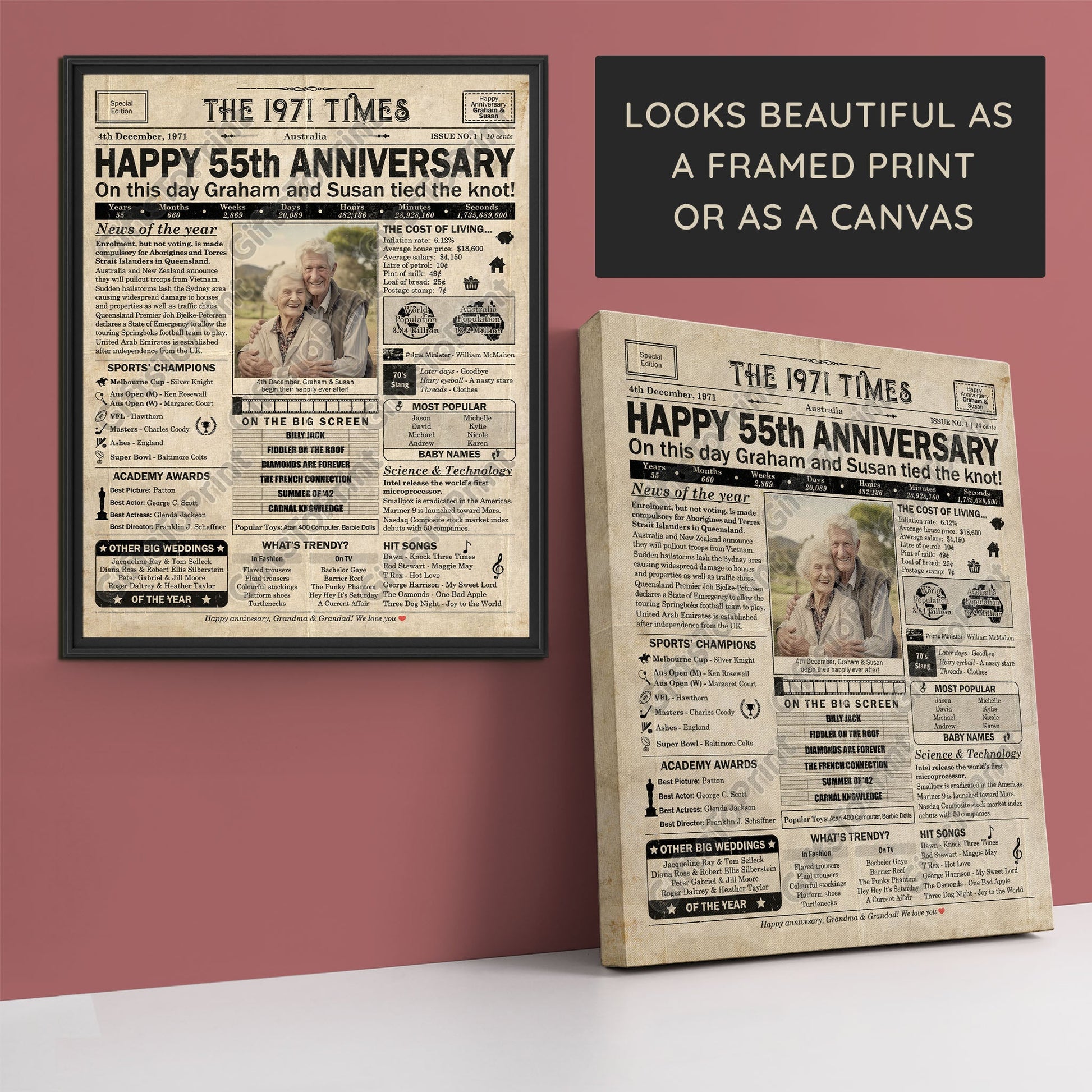 55th Anniversary – Australia Version. A printable, personalised anniversary poster with news, fun facts, and highlights of what happened in 1971, finished as a realistic, aged newspaper look. Add a photo, names, wedding date, and even a special message for the bottom of the "newspaper" to give it a personal touch. It makes a beautiful keepsake gift when printed and framed.