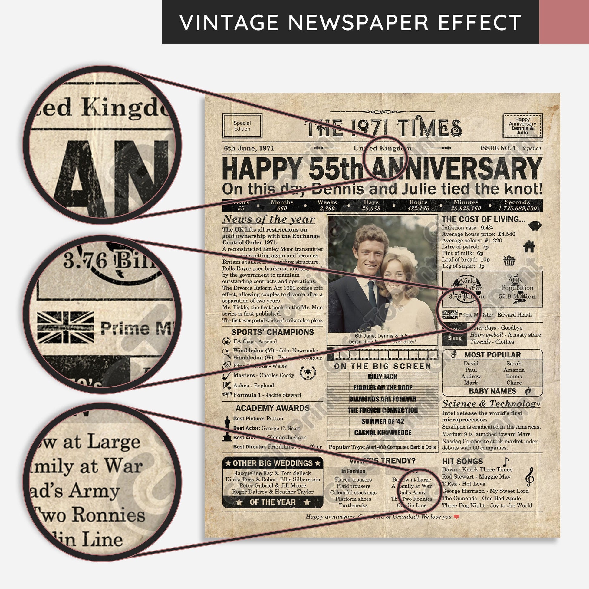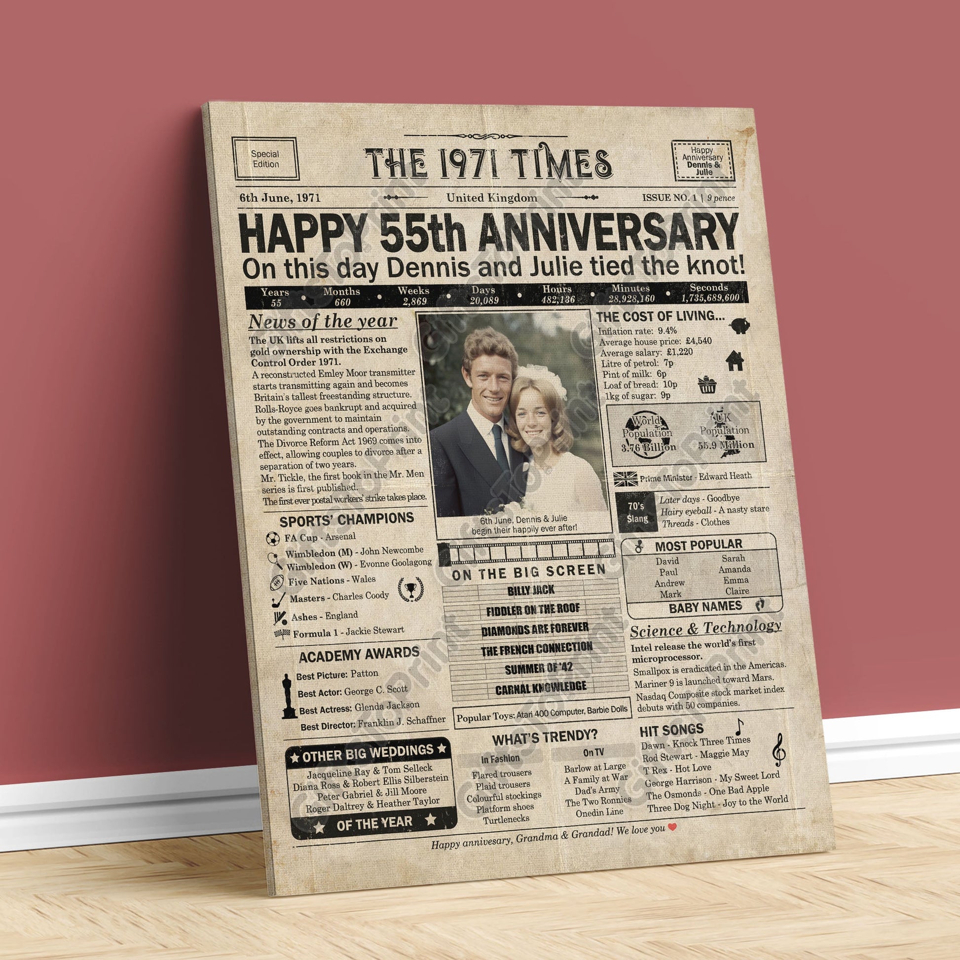55th Anniversary – UK Version. A printable, personalised anniversary poster with news, fun facts, and highlights of what happened in 1971, finished as a realistic, aged newspaper look. Add a photo, names, wedding date, and even a special message for the bottom of the "newspaper" to give it a personal touch. It makes a beautiful keepsake gift when printed and framed.