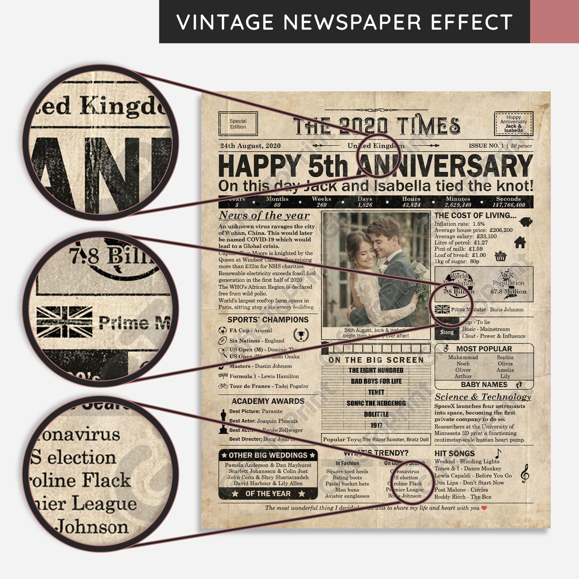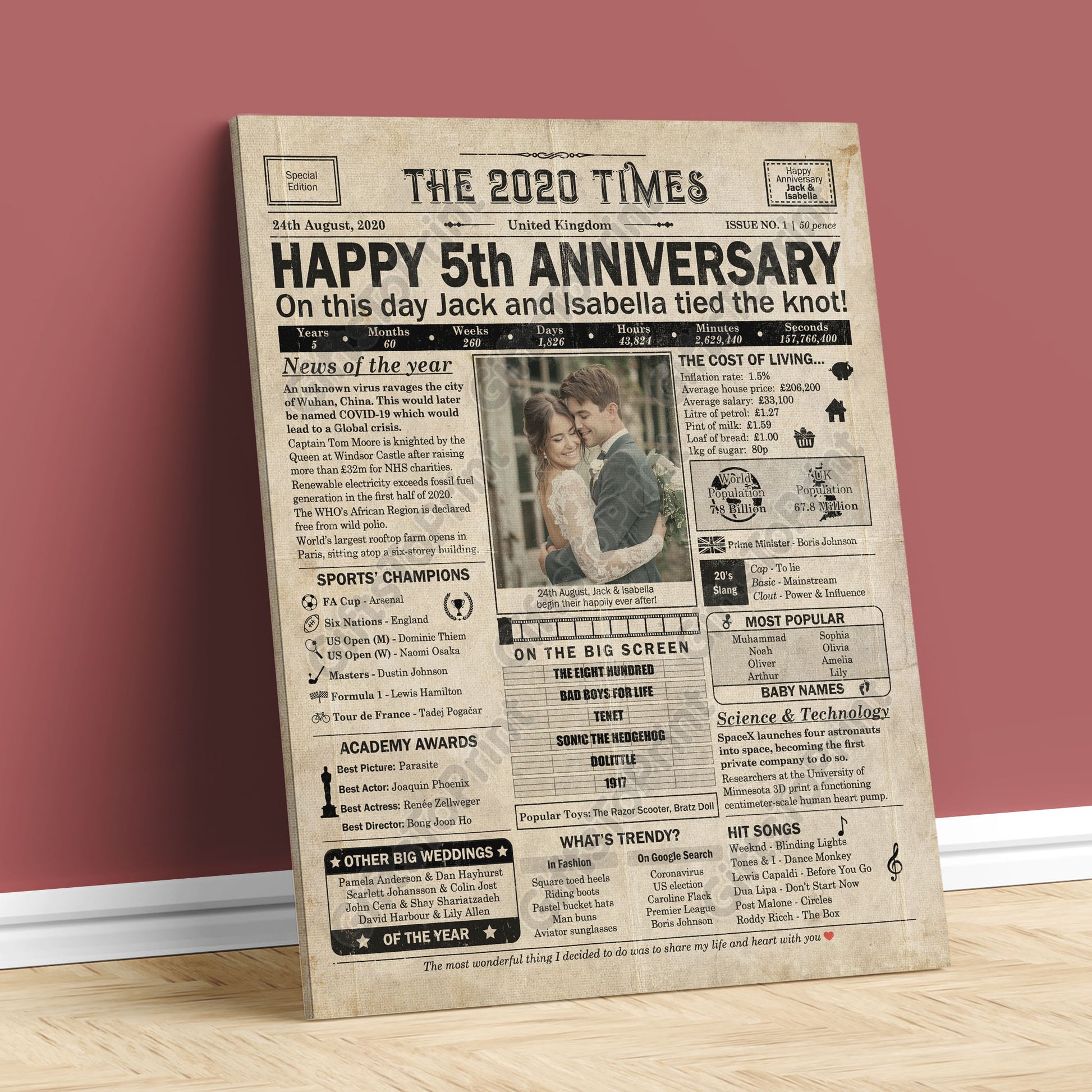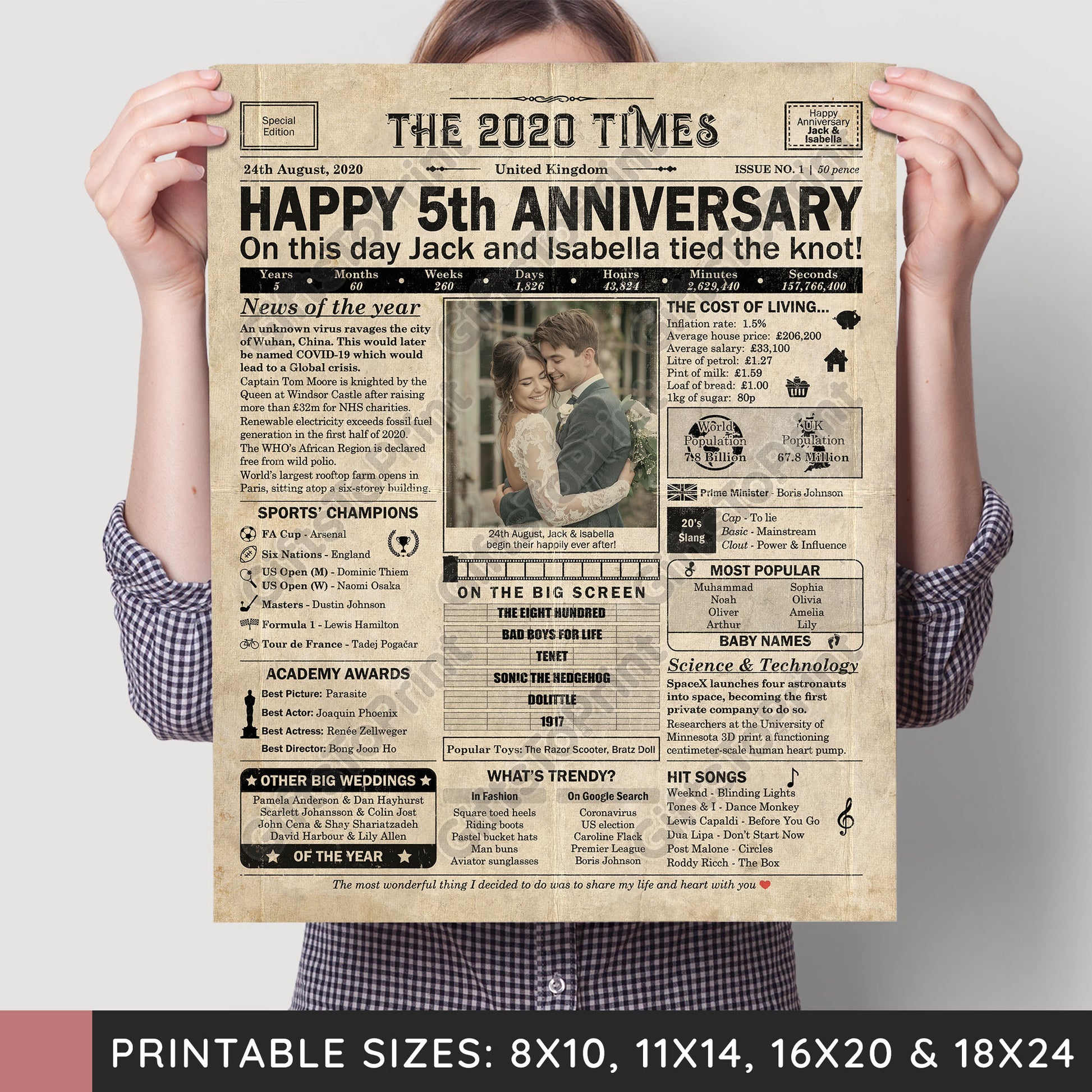 5th Anniversary – UK Version. A printable, personalised anniversary poster with news, fun facts, and highlights of what happened in 2020, finished as a realistic, aged newspaper look. Add a photo, names, wedding date, and even a special message for the bottom of the "newspaper" to give it a personal touch. It makes a beautiful keepsake gift when printed and framed.