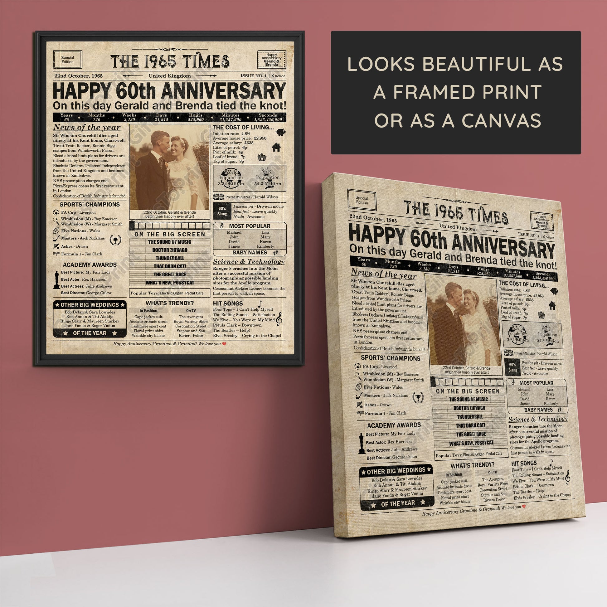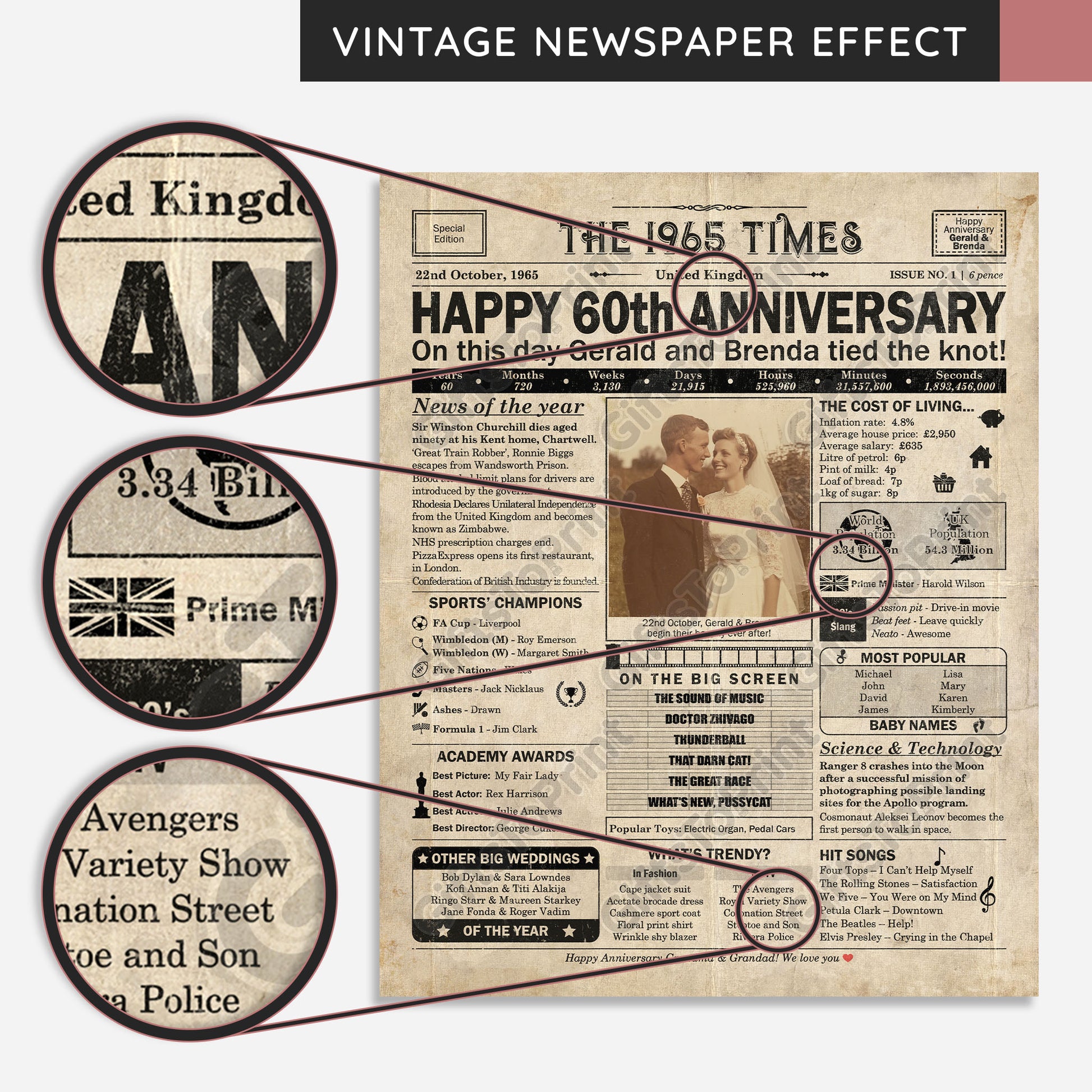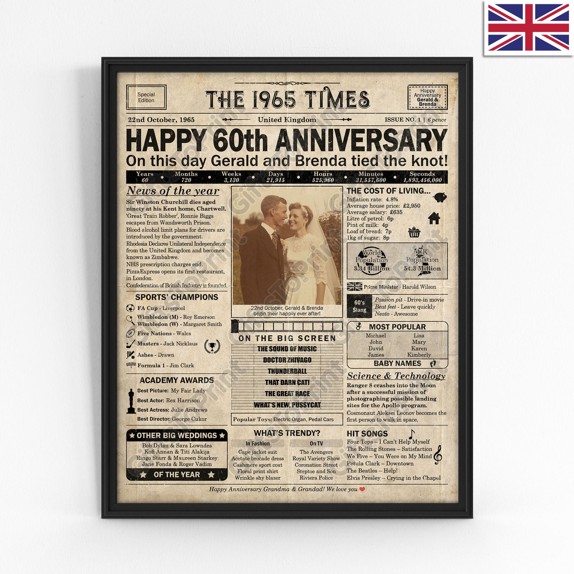 60th Anniversary – UK Version. A printable, personalised anniversary poster with news, fun facts, and highlights of what happened in 1965, finished as a realistic, aged newspaper look. Add a photo, names, wedding date, and even a special message for the bottom of the "newspaper" to give it a personal touch. It makes a beautiful keepsake gift when printed and framed.