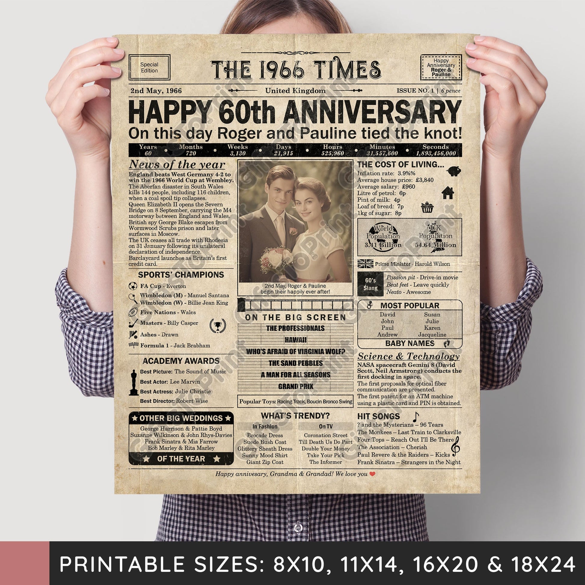 60th Anniversary – UK Version. A printable, personalised anniversary poster with news, fun facts, and highlights of what happened in 1966, finished as a realistic, aged newspaper look. Add a photo, names, wedding date, and even a special message for the bottom of the "newspaper" to give it a personal touch. It makes a beautiful keepsake gift when printed and framed.
