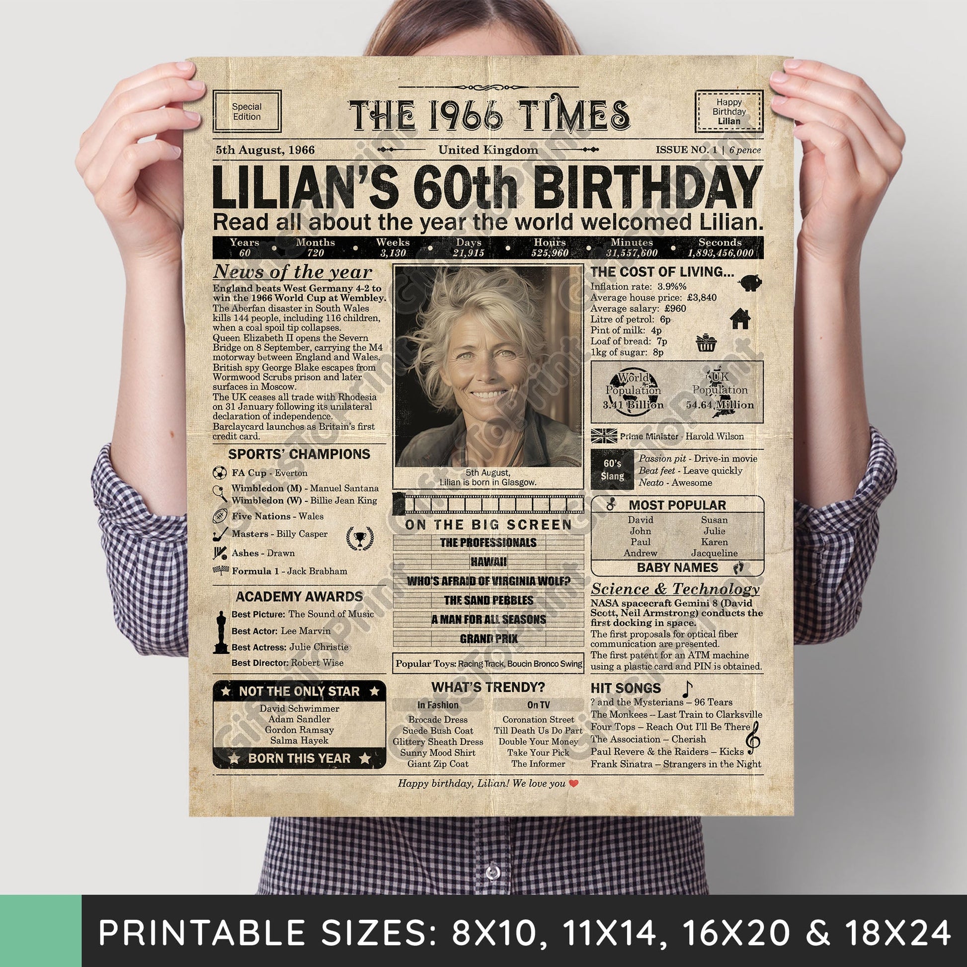 60th Birthday – UK Version. A printable, personalised birthday poster with news, fun facts, and highlights of what happened in 1966, finished as a realistic, aged newspaper look. Add a photo, name, date of birth, place of birth and even a special message for the bottom of the "newspaper" to give it a personal touch. It makes a beautiful keepsake gift when printed and framed.