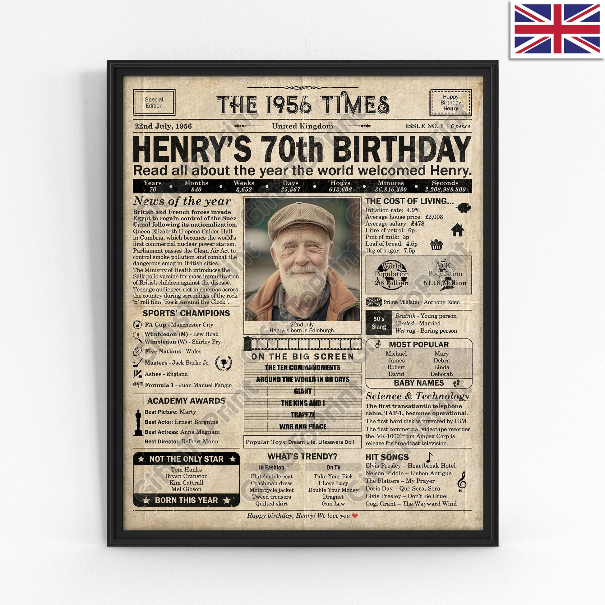 70th Birthday – UK Version. A printable, personalised birthday poster with news, fun facts, and highlights of what happened in 1956, finished as a realistic, aged newspaper look. Add a photo, name, date of birth, place of birth and even a special message for the bottom of the "newspaper" to give it a personal touch. It makes a beautiful keepsake gift when printed and framed.