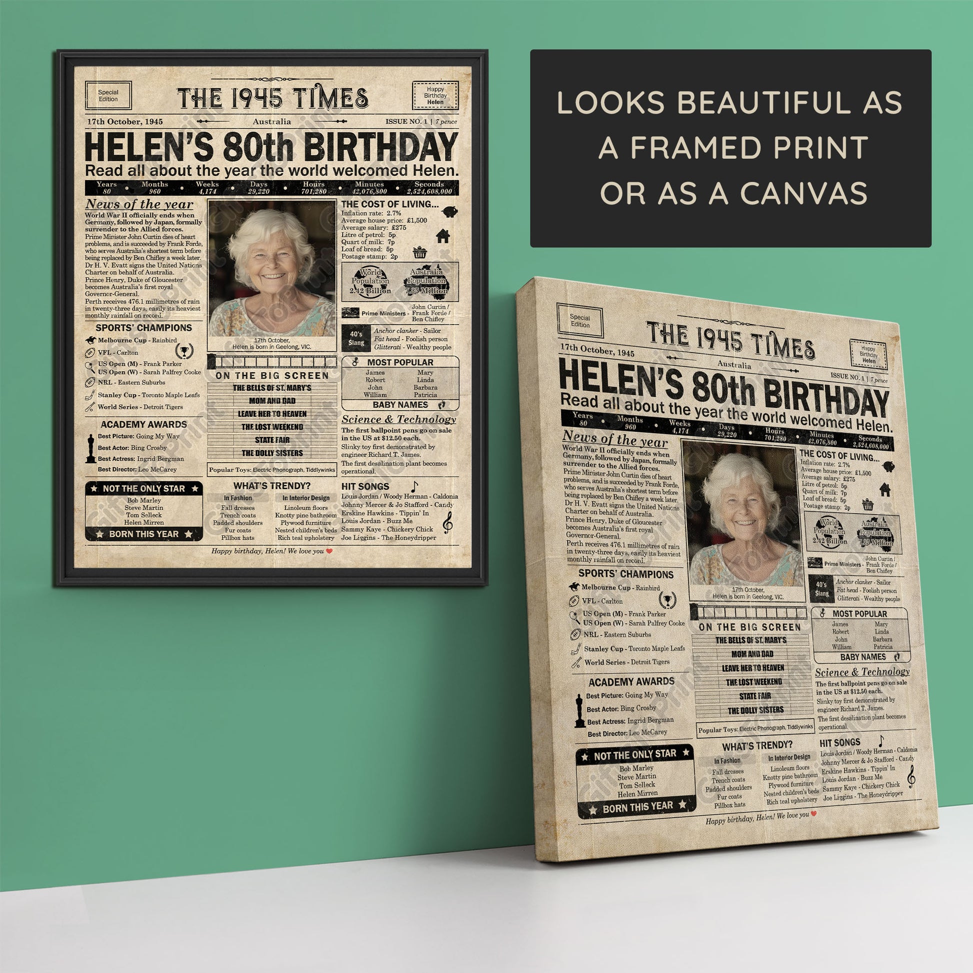 80th Birthday – Australia Version. A printable, personalised birthday poster with news, fun facts, and highlights of what happened in 1945, finished as a realistic, aged newspaper look. Add a photo, name, date of birth, place of birth and even a special message for the bottom of the "newspaper" to give it a personal touch. It makes a beautiful keepsake gift when printed and framed.