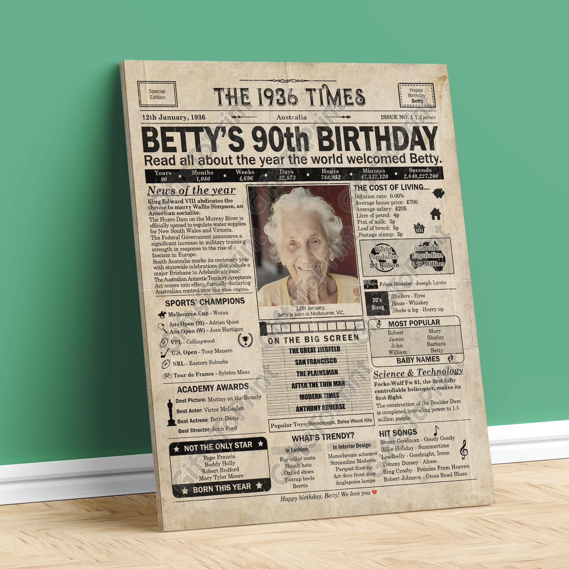 90th Birthday – Australia Version. A printable, personalised birthday poster with news, fun facts, and highlights of what happened in 1936, finished as a realistic, aged newspaper look. Add a photo, name, date of birth, place of birth and even a special message for the bottom of the "newspaper" to give it a personal touch. It makes a beautiful keepsake gift when printed and framed.