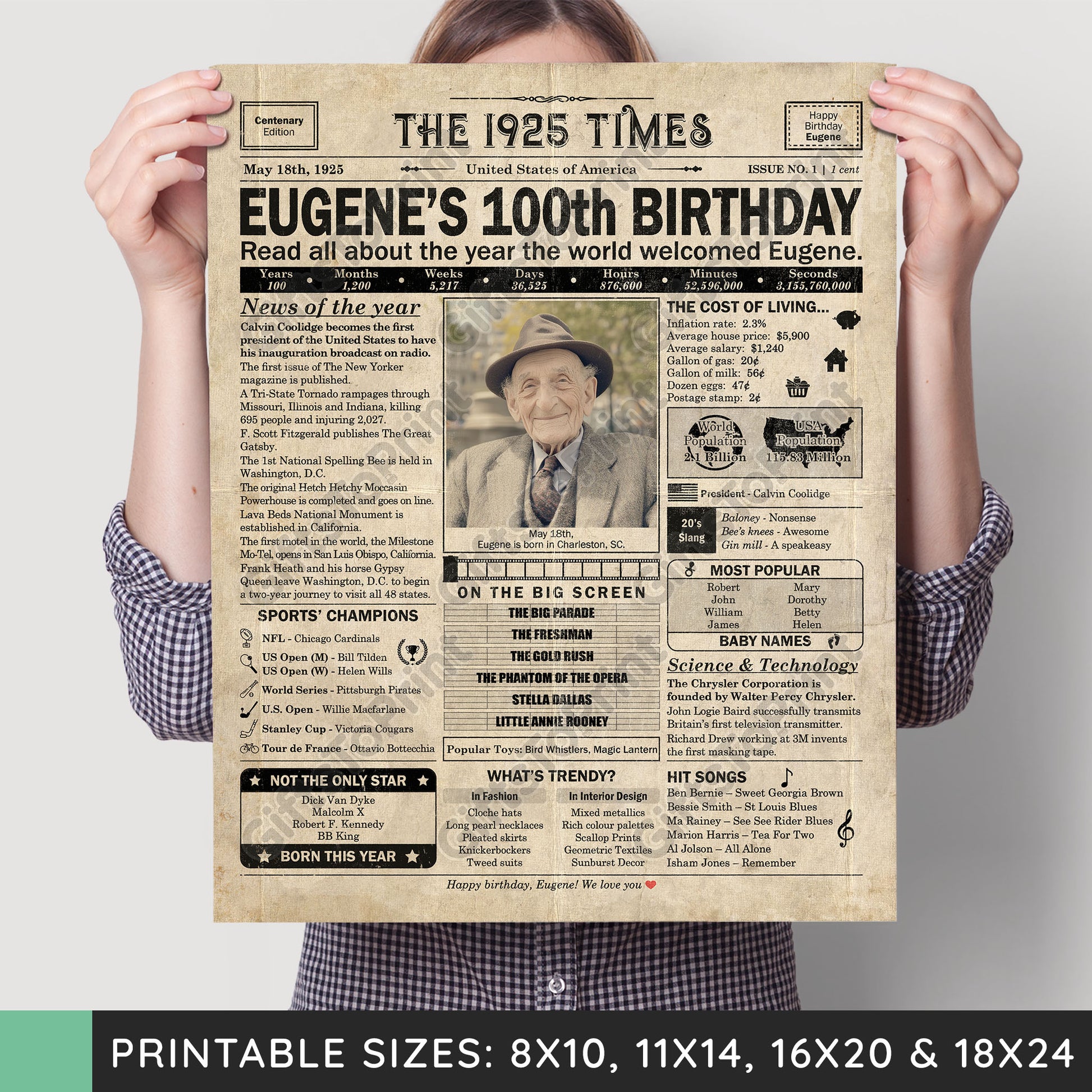 100th Birthday – US Version. A printable, personalized birthday poster with news, fun facts, and highlights of what happened in 1925, finished as a realistic, aged newspaper look. Add a photo, name, date of birth, place of birth and even a special message for the bottom of the "newspaper" to give it a personal touch. It makes a beautiful keepsake gift when printed and framed.