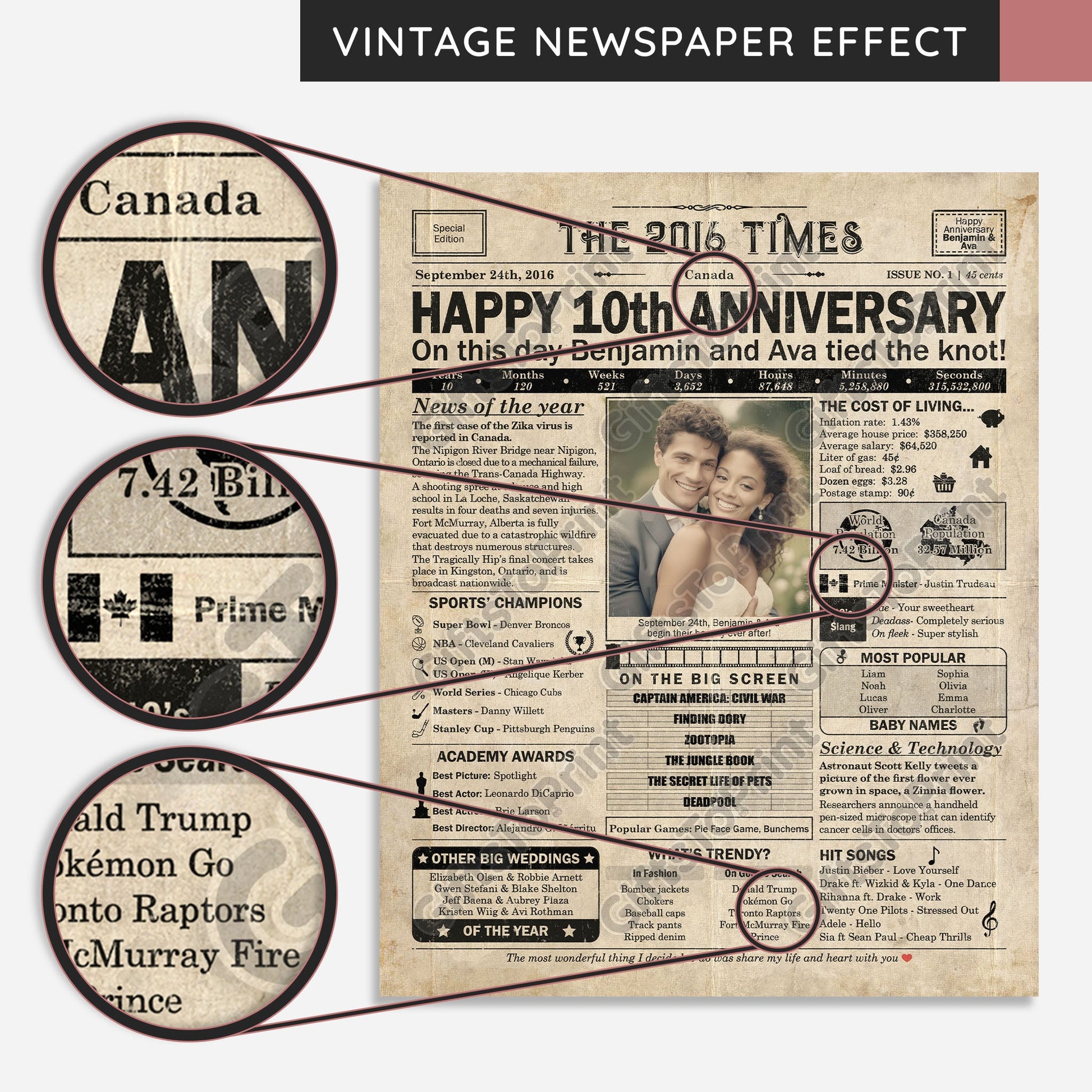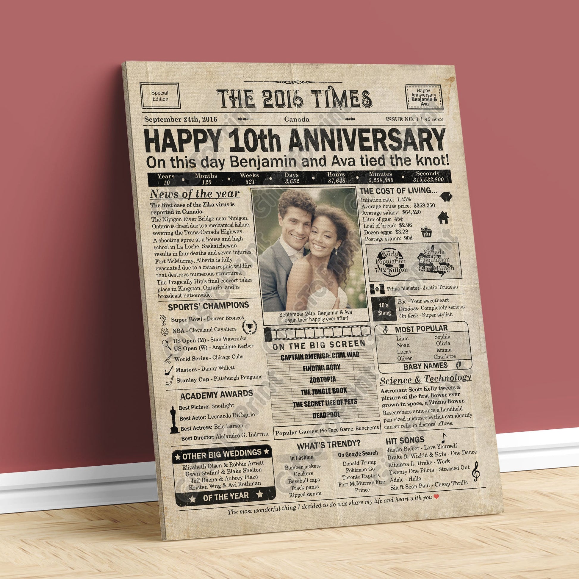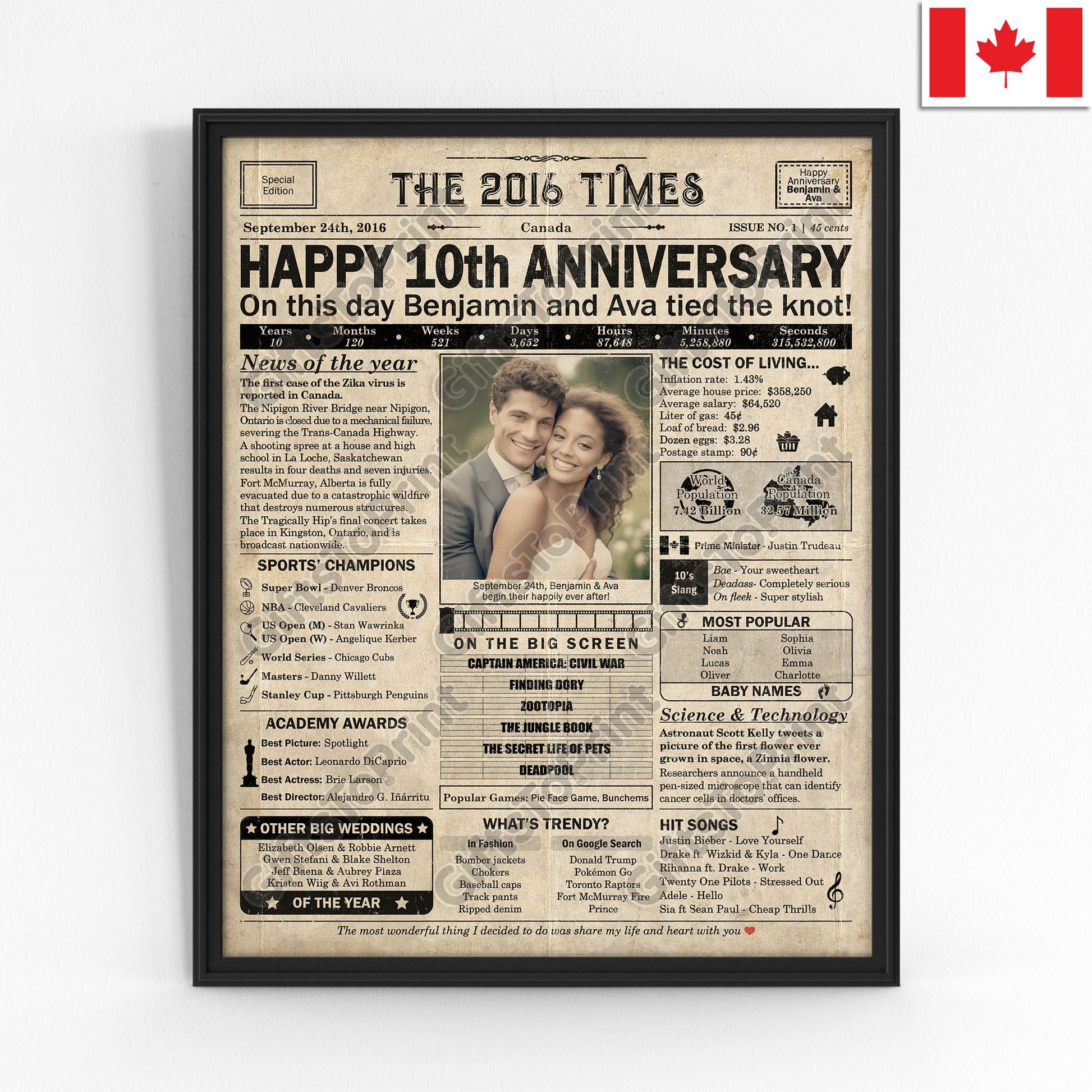10th Anniversary – Canada Version. A printable, personalized anniversary poster with news, fun facts, and highlights of what happened in 2016, finished as a realistic, aged newspaper look. Add a photo, names, wedding date, and even a special message for the bottom of the "newspaper" to give it a personal touch. It makes a beautiful keepsake gift when printed and framed.