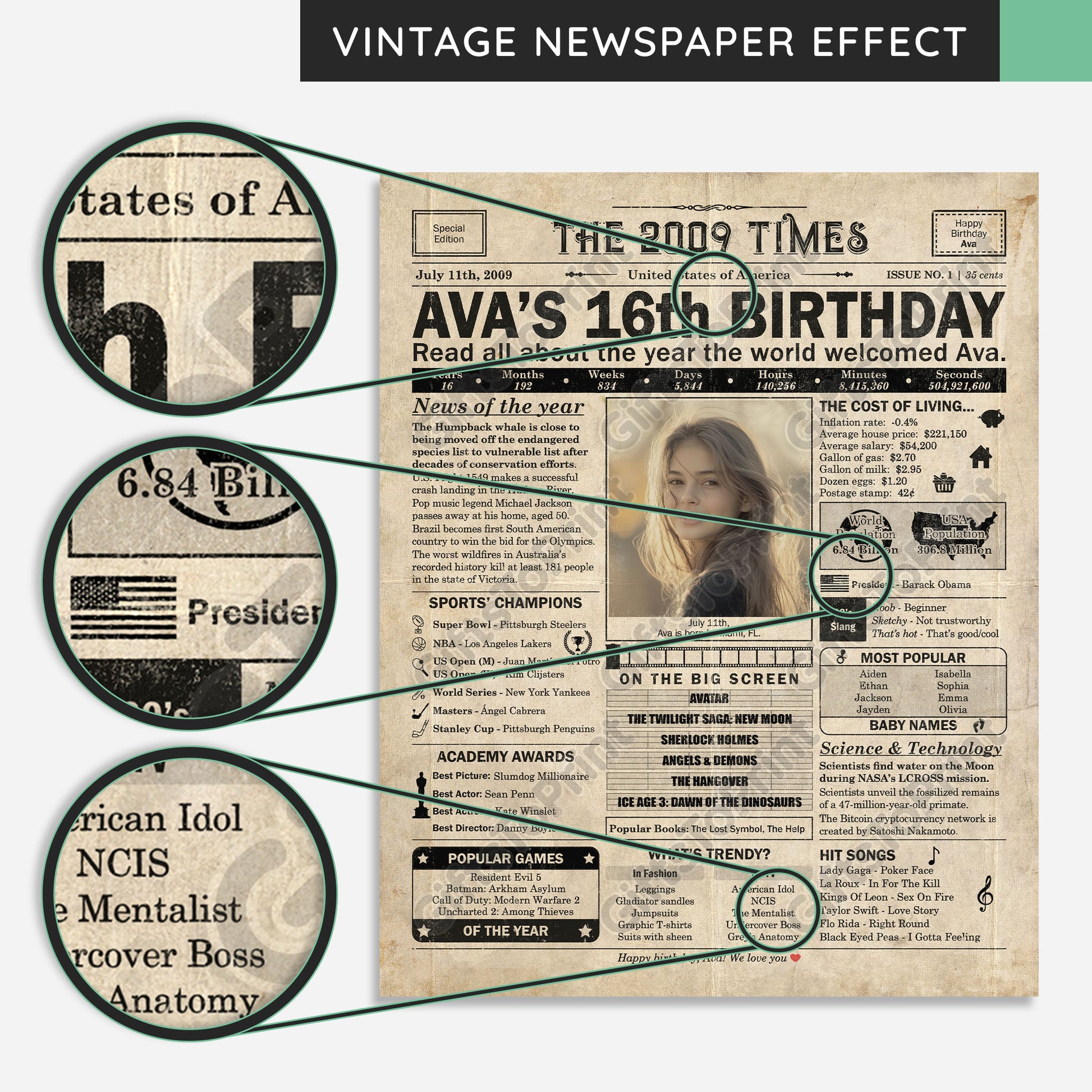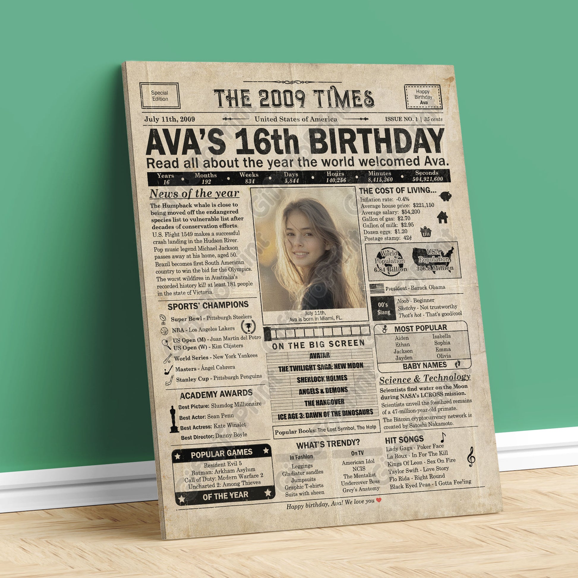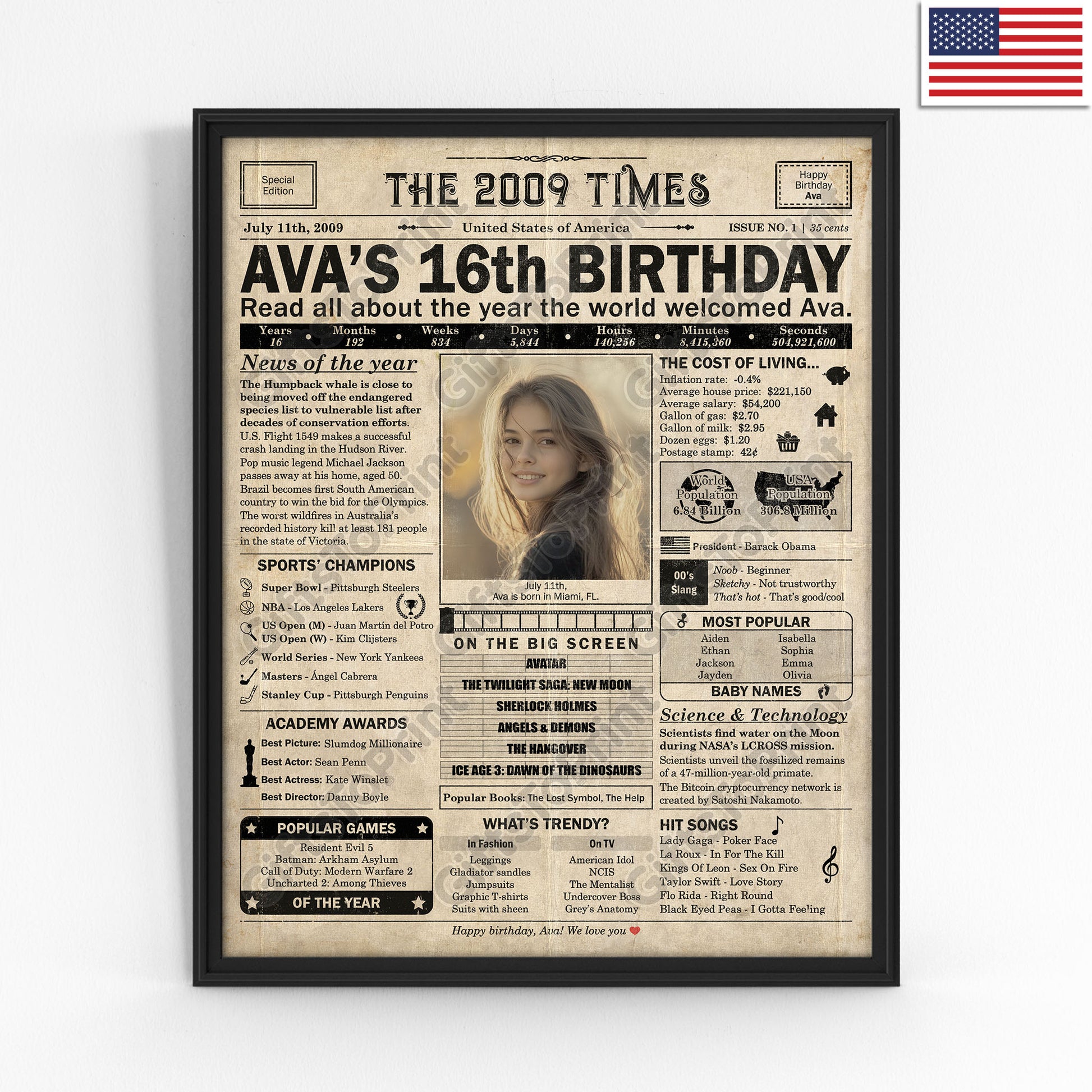 16th Birthday – US Version. A printable, personalized birthday poster with news, fun facts, and highlights of what happened in 2009, finished as a realistic, aged newspaper look. Add a photo, name, date of birth, place of birth and even a special message for the bottom of the "newspaper" to give it a personal touch. It makes a beautiful keepsake gift when printed and framed.