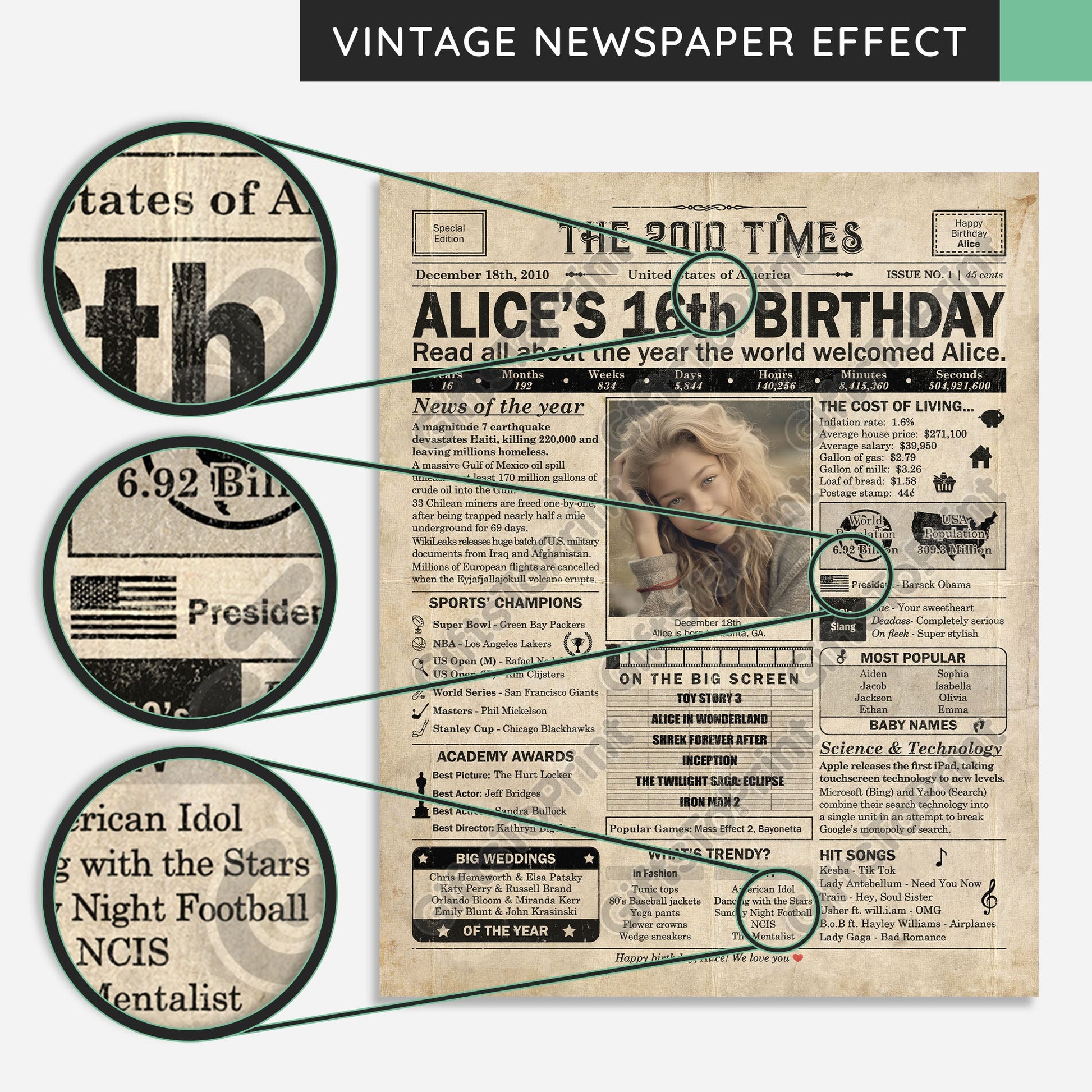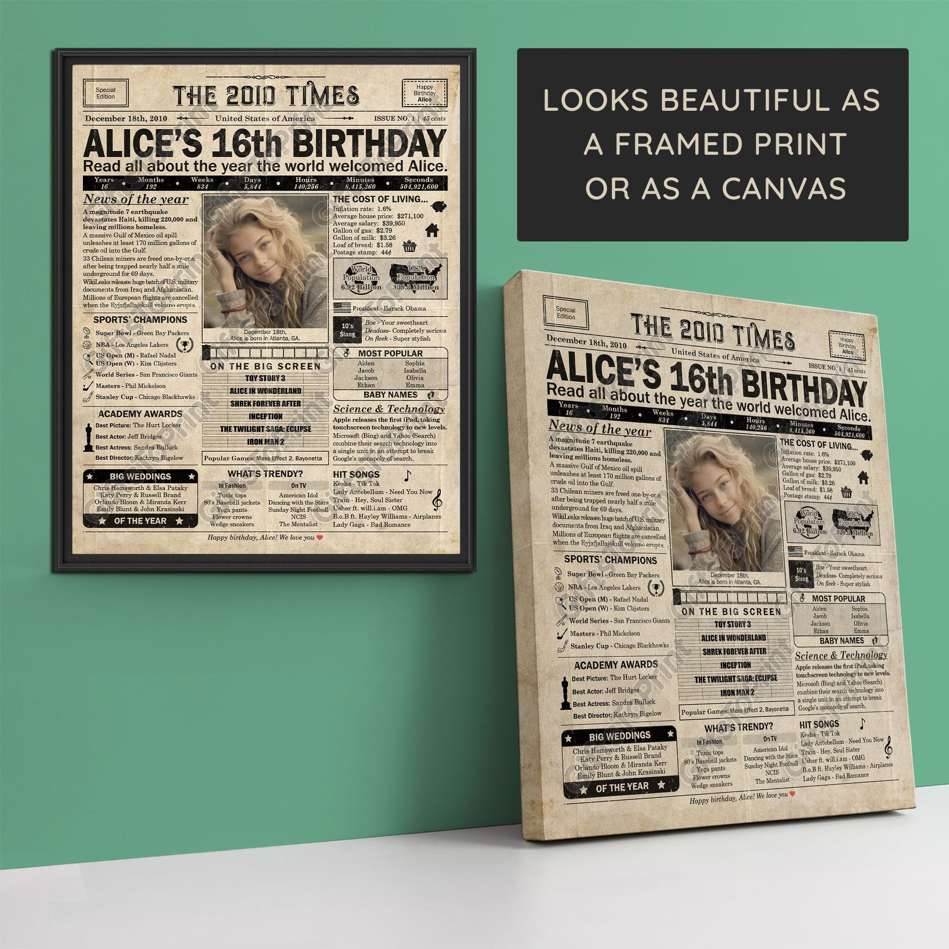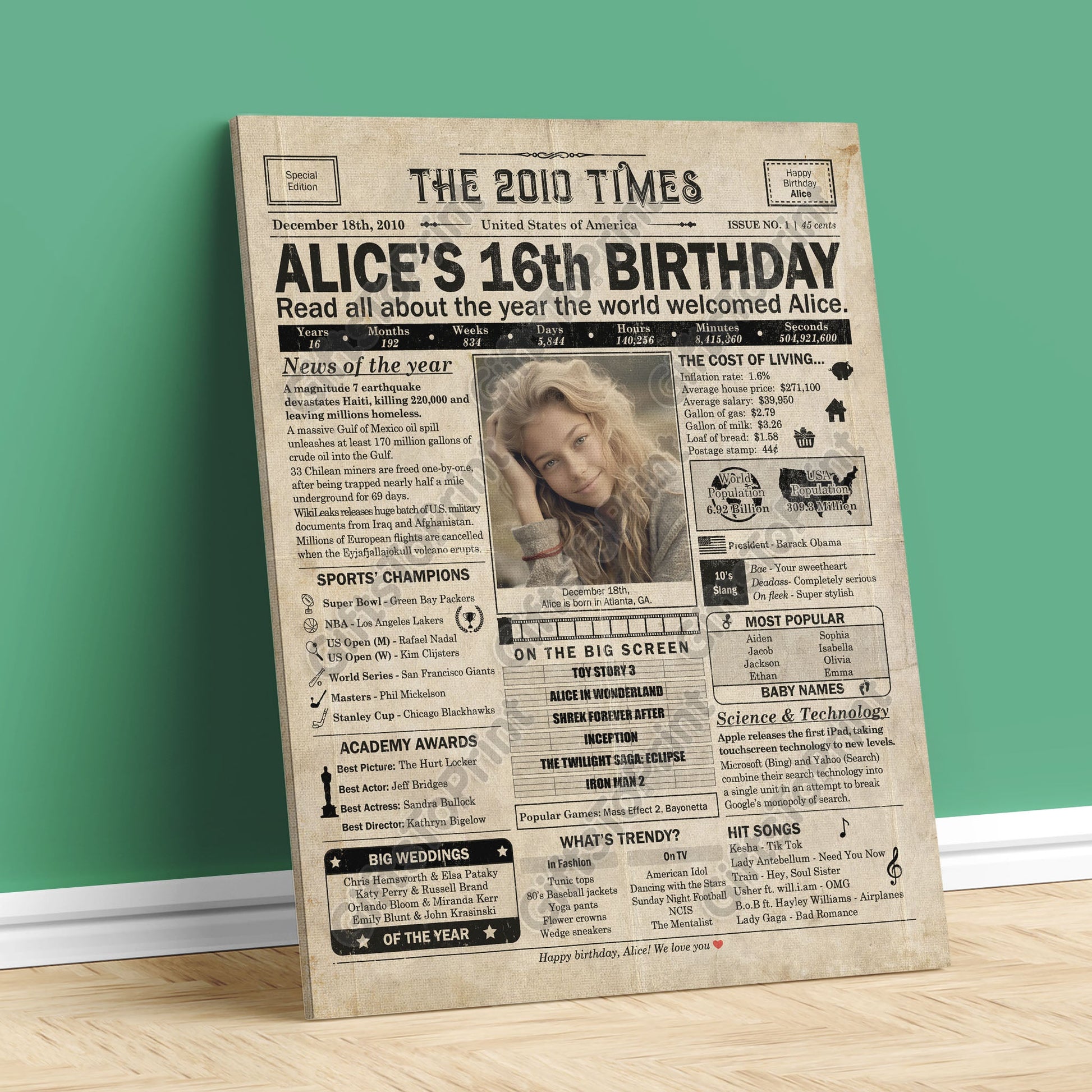 16th Birthday – US Version. A printable, personalized birthday poster with news, fun facts, and highlights of what happened in 2010, finished as a realistic, aged newspaper look. Add a photo, name, date of birth, place of birth and even a special message for the bottom of the "newspaper" to give it a personal touch. It makes a beautiful keepsake gift when printed and framed.