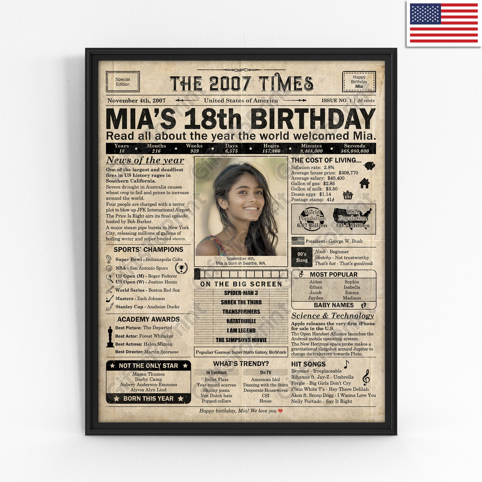 18th Birthday – US Version. A printable, personalized birthday poster with news, fun facts, and highlights of what happened in 2007, finished as a realistic, aged newspaper look. Add a photo, name, date of birth, place of birth and even a special message for the bottom of the "newspaper" to give it a personal touch. It makes a beautiful keepsake gift when printed and framed.