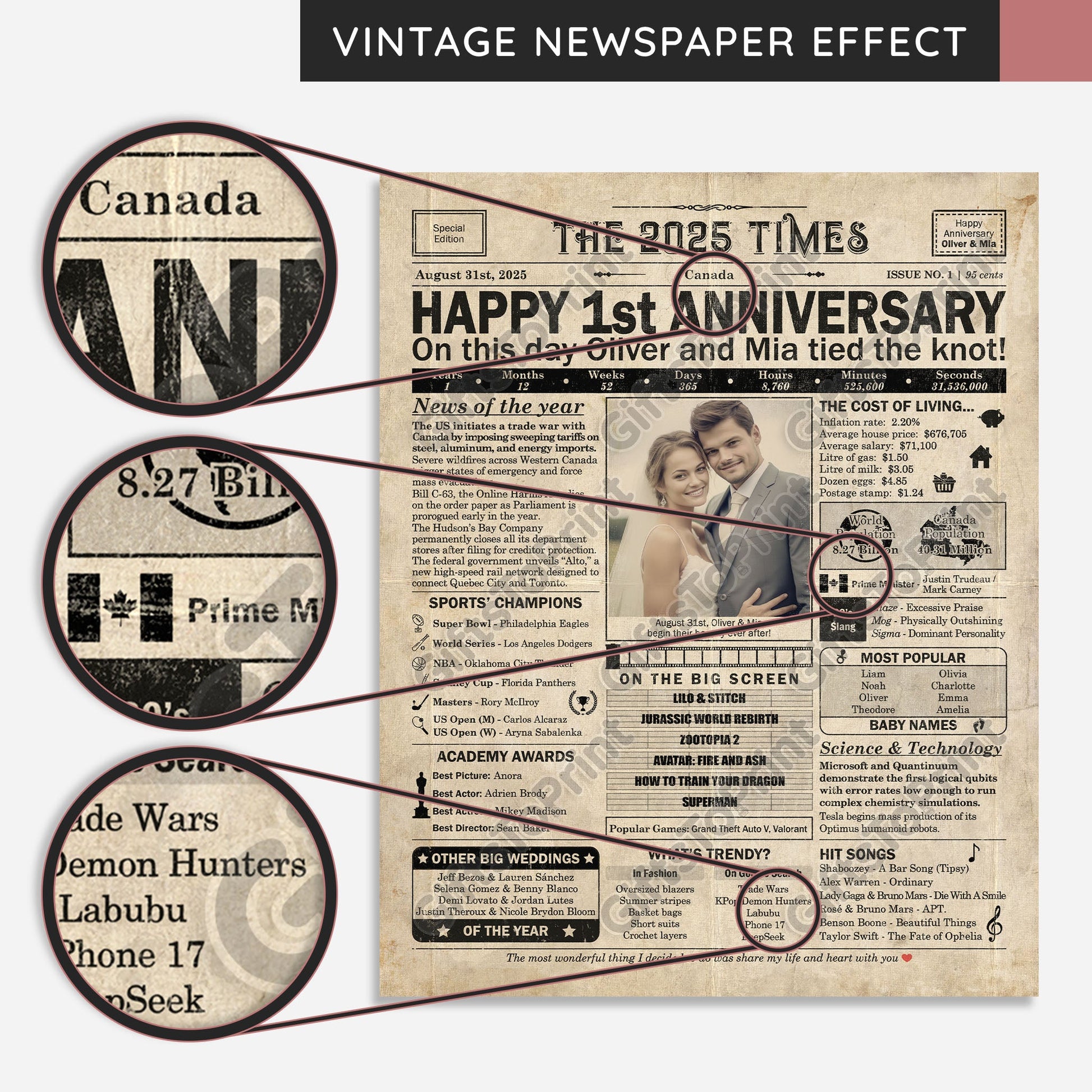 1st Anniversary – Canada Version. A printable, personalized anniversary poster with news, fun facts, and highlights of what happened in 2025, finished as a realistic, aged newspaper look. Add a photo, names, wedding date, and even a special message for the bottom of the "newspaper" to give it a personal touch. It makes a beautiful keepsake gift when printed and framed.