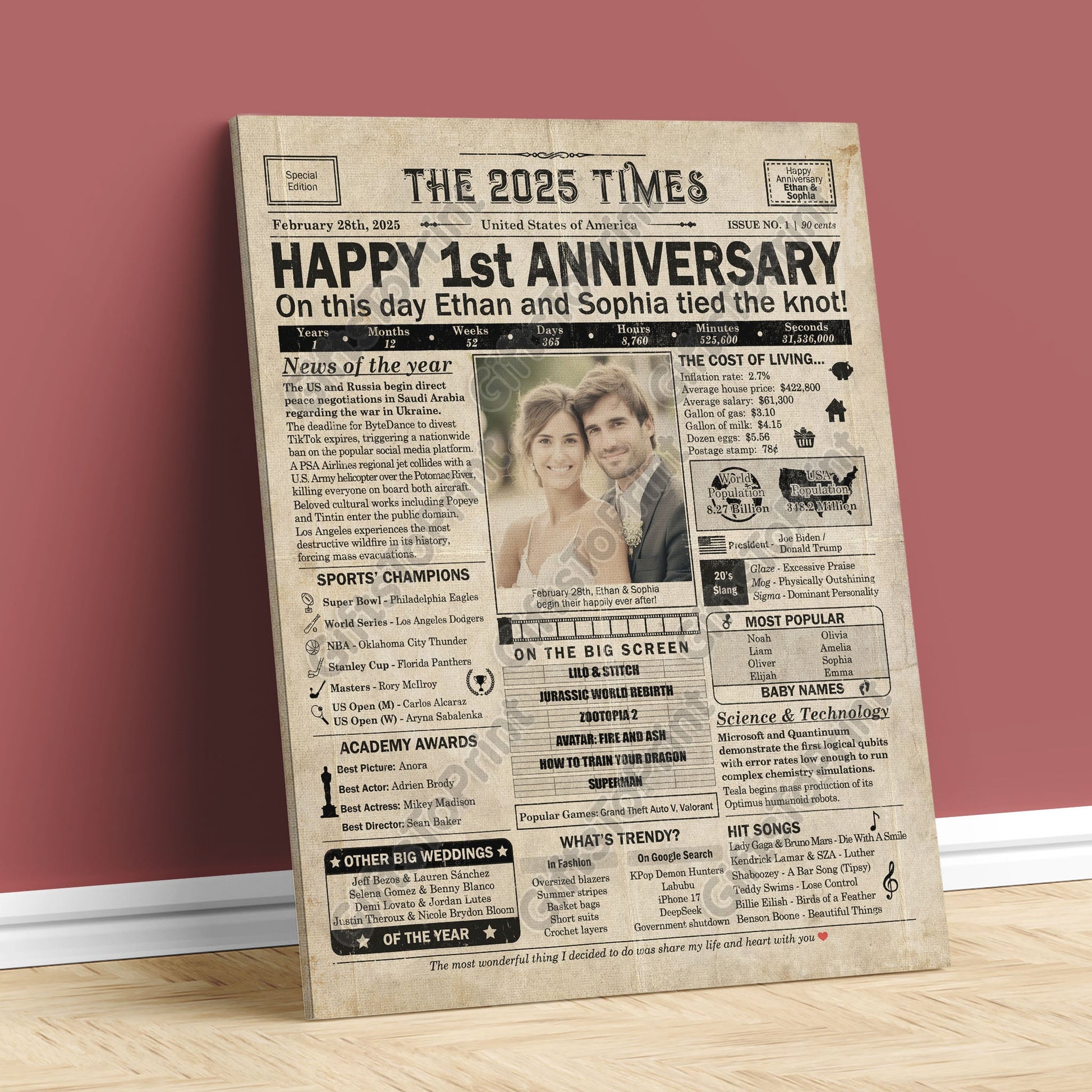 1st Anniversary – US Version. A printable, personalized anniversary poster with news, fun facts, and highlights of what happened in 2025, finished as a realistic, aged newspaper look. Add a photo, names, wedding date, and even a special message for the bottom of the "newspaper" to give it a personal touch. It makes a beautiful keepsake gift when printed and framed.