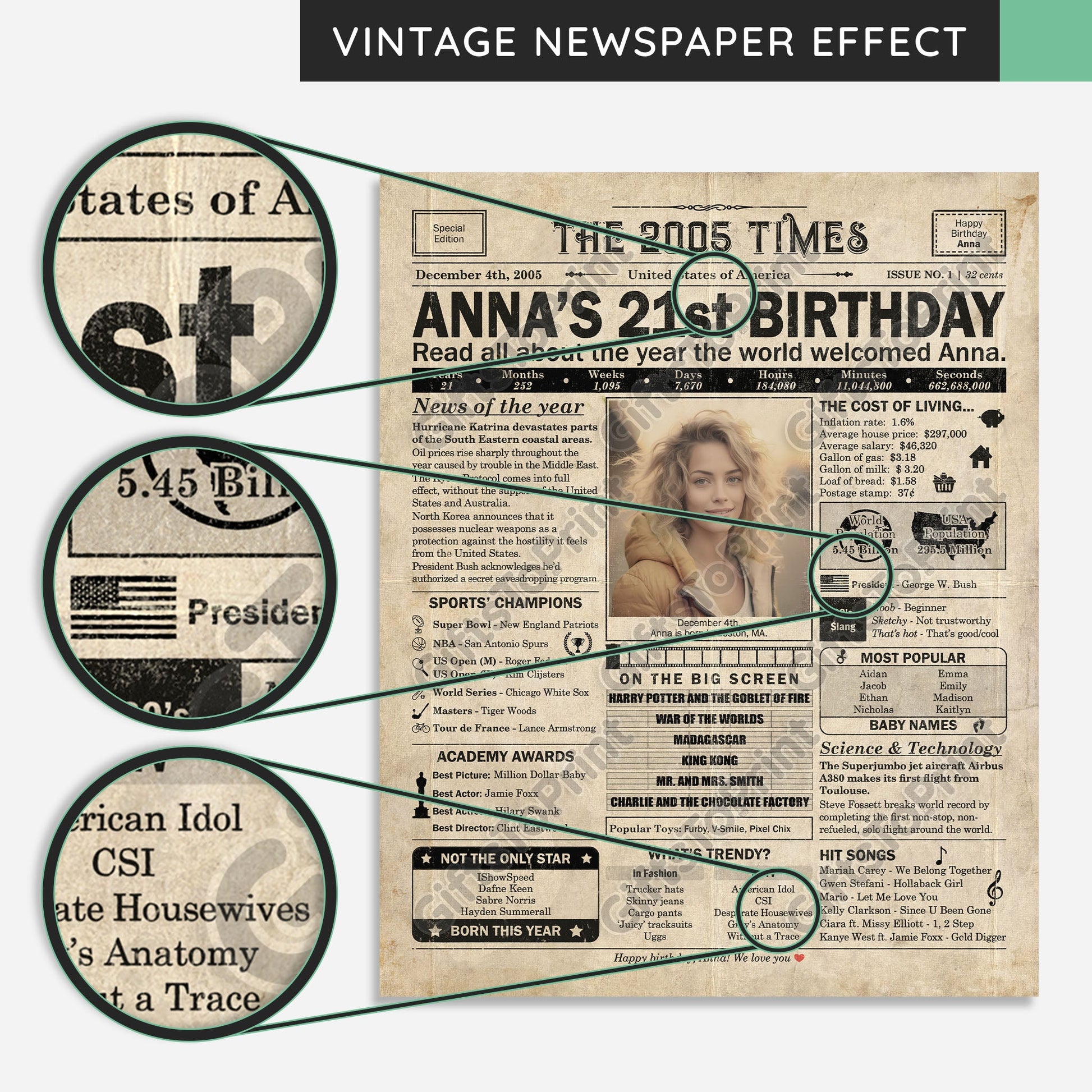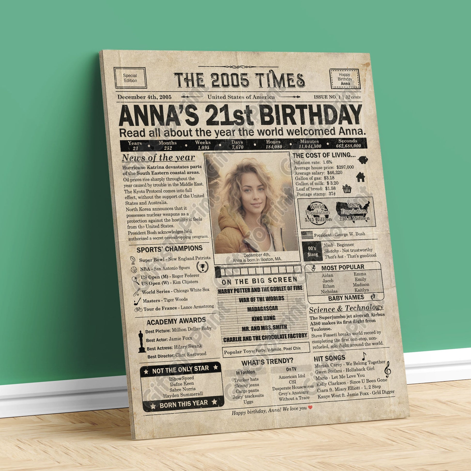 21st Birthday – US Version. A printable, personalized birthday poster with news, fun facts, and highlights of what happened in 2005, finished as a realistic, aged newspaper look. Add a photo, name, date of birth, place of birth and even a special message for the bottom of the "newspaper" to give it a personal touch. It makes a beautiful keepsake gift when printed and framed.