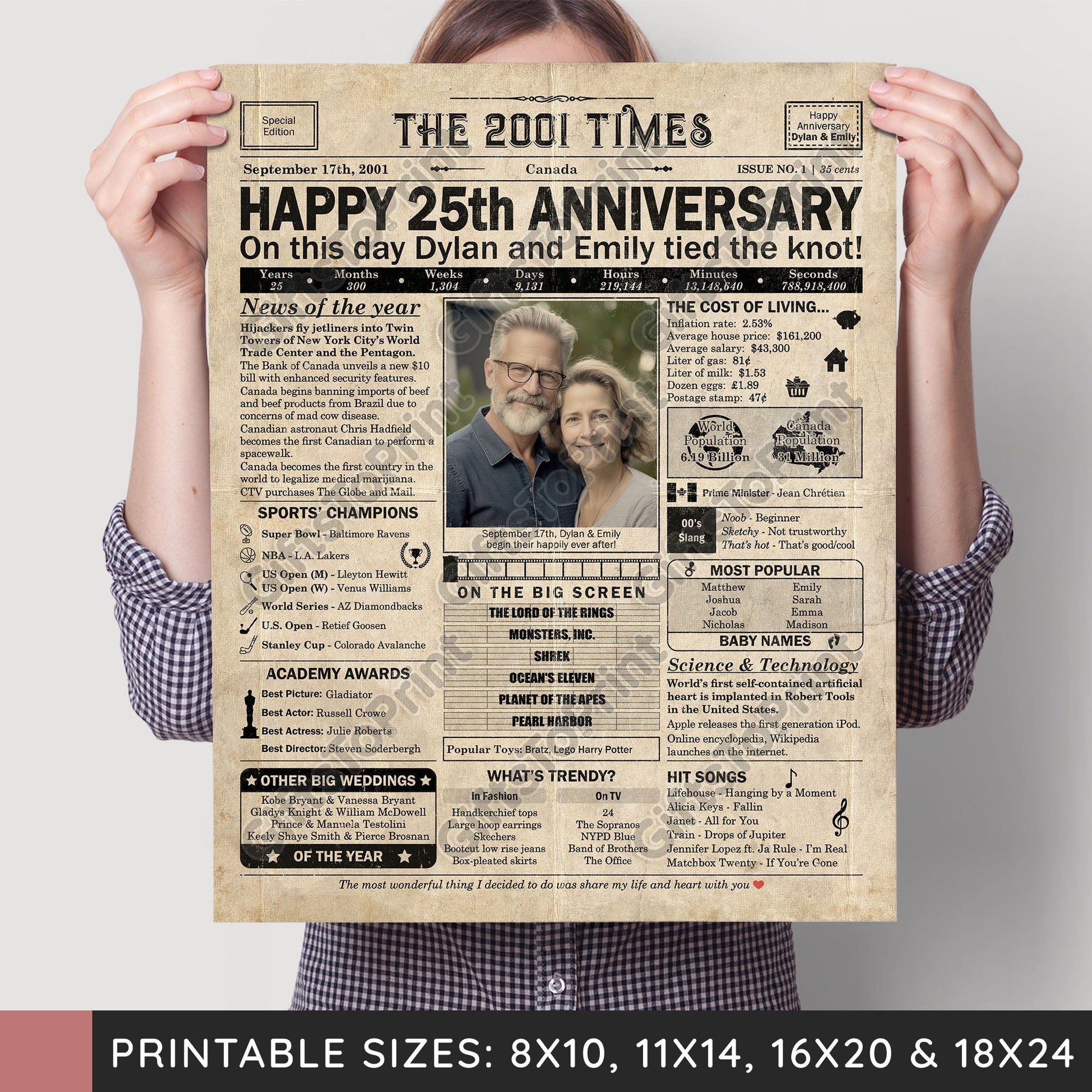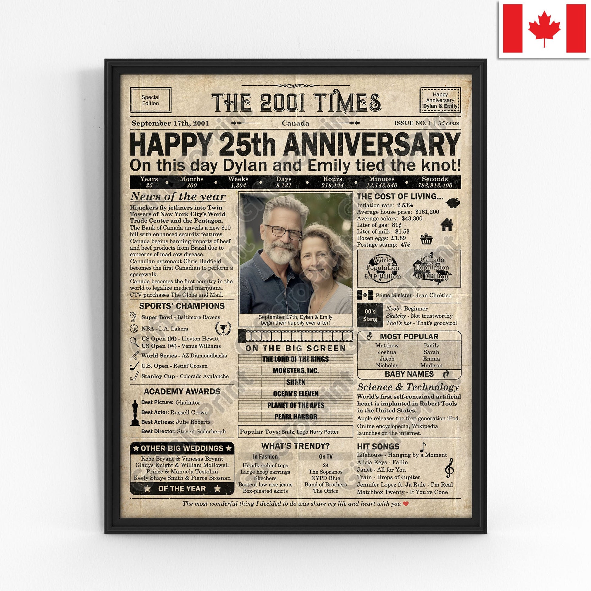 25th Anniversary – Canada Version. A printable, personalized anniversary poster with news, fun facts, and highlights of what happened in 2001, finished as a realistic, aged newspaper look. Add a photo, names, wedding date, and even a special message for the bottom of the "newspaper" to give it a personal touch. It makes a beautiful keepsake gift when printed and framed.