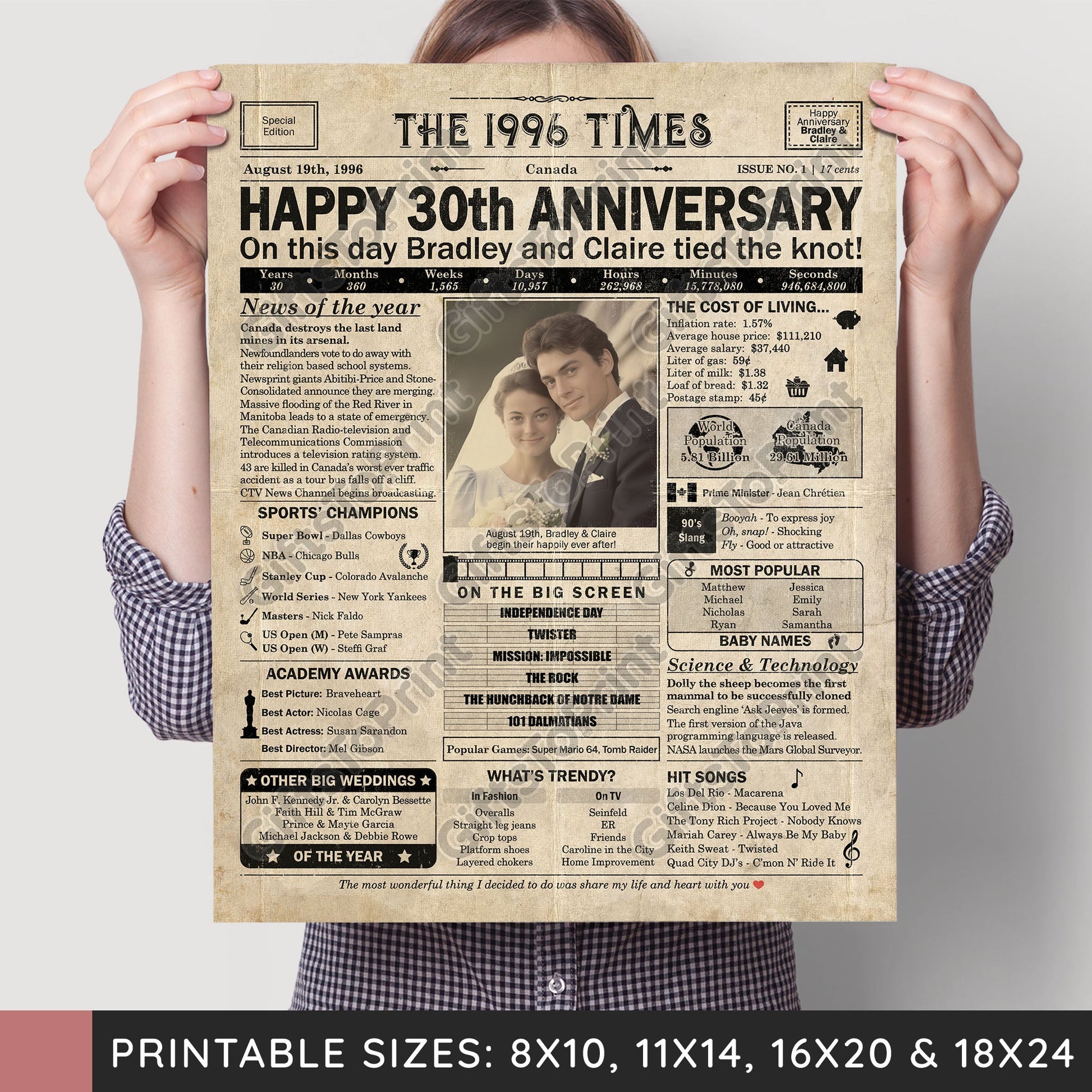 30th Anniversary – Canada Version. A printable, personalized anniversary poster with news, fun facts, and highlights of what happened in 1996, finished as a realistic, aged newspaper look. Add a photo, names, wedding date, and even a special message for the bottom of the "newspaper" to give it a personal touch. It makes a beautiful keepsake gift when printed and framed.