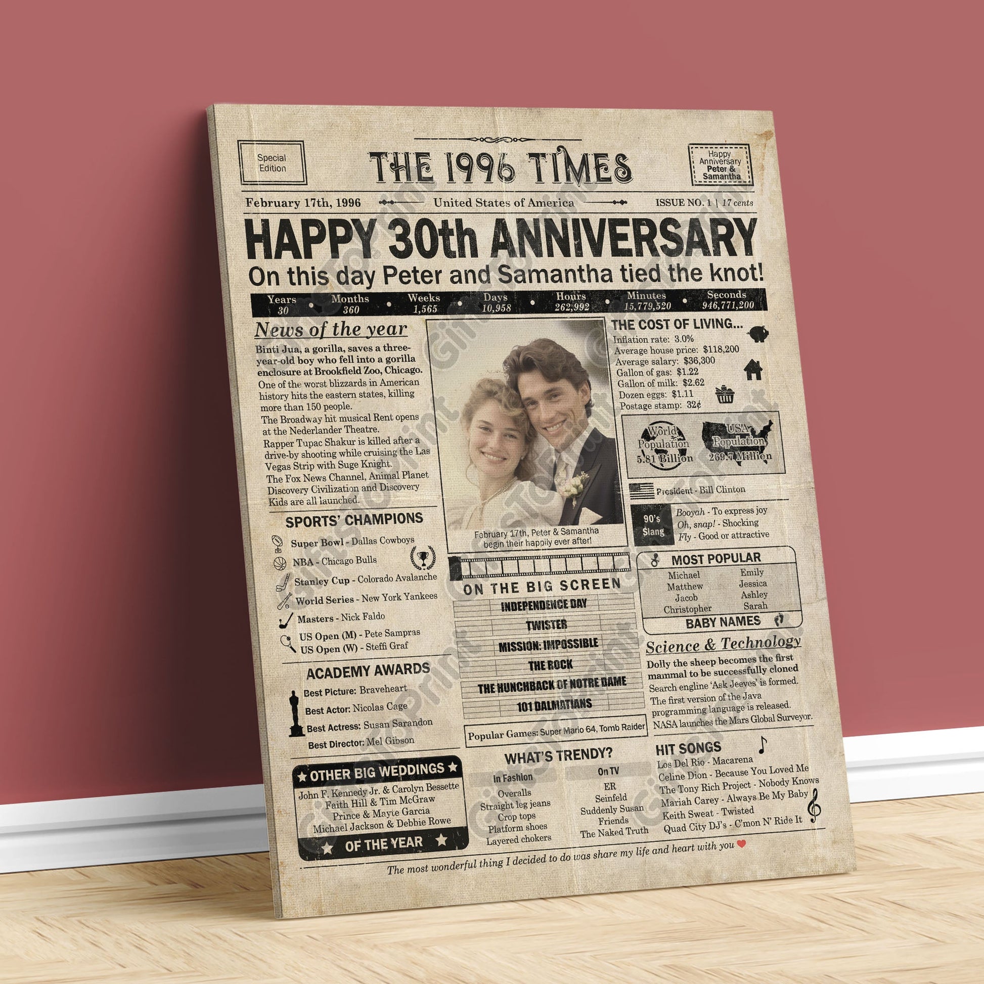 30th Anniversary – US Version. A printable, personalized anniversary poster with news, fun facts, and highlights of what happened in 1996, finished as a realistic, aged newspaper look. Add a photo, names, wedding date, and even a special message for the bottom of the "newspaper" to give it a personal touch. It makes a beautiful keepsake gift when printed and framed.