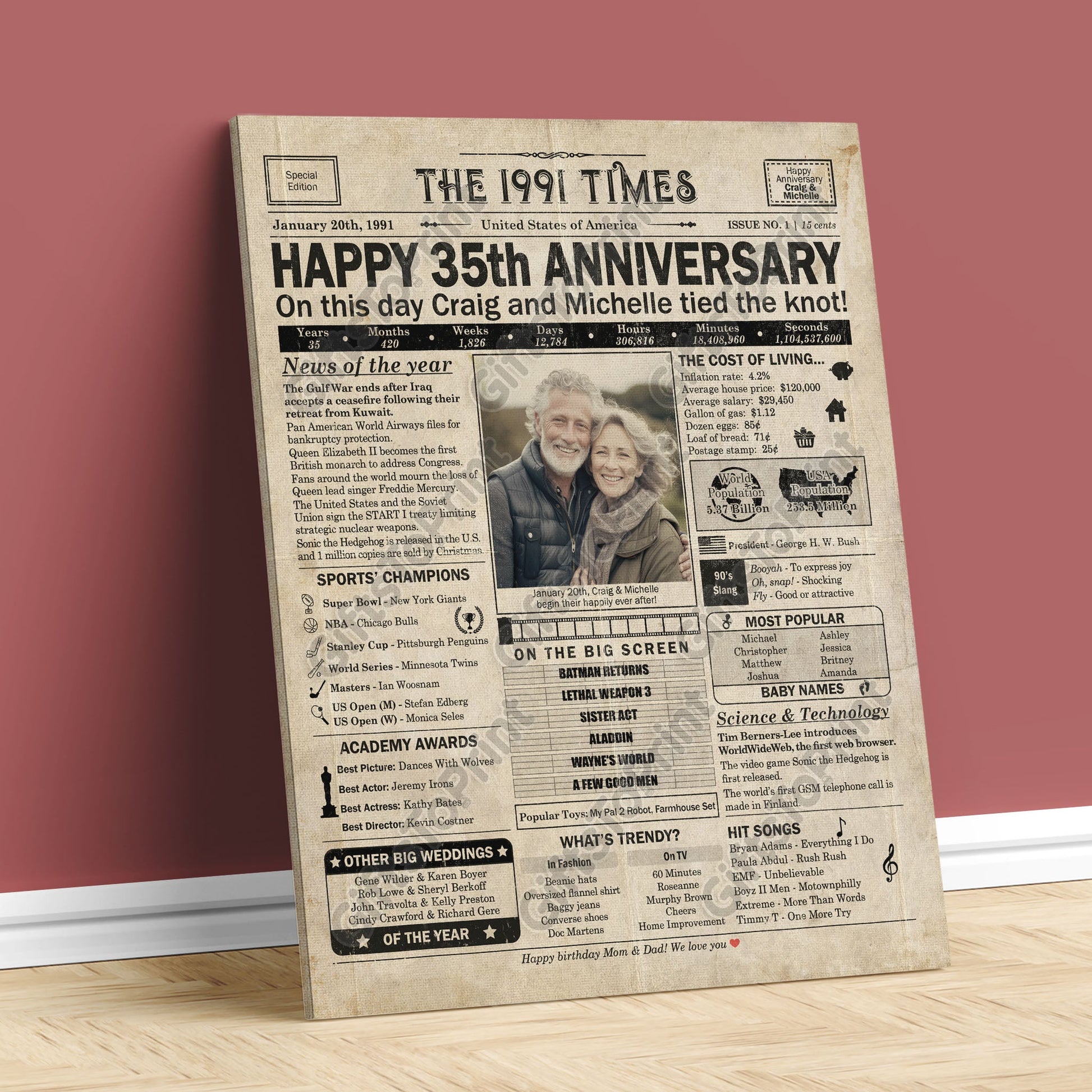 35th Anniversary – US Version. A printable, personalized anniversary poster with news, fun facts, and highlights of what happened in 1991, finished as a realistic, aged newspaper look. Add a photo, names, wedding date, and even a special message for the bottom of the "newspaper" to give it a personal touch. It makes a beautiful keepsake gift when printed and framed.