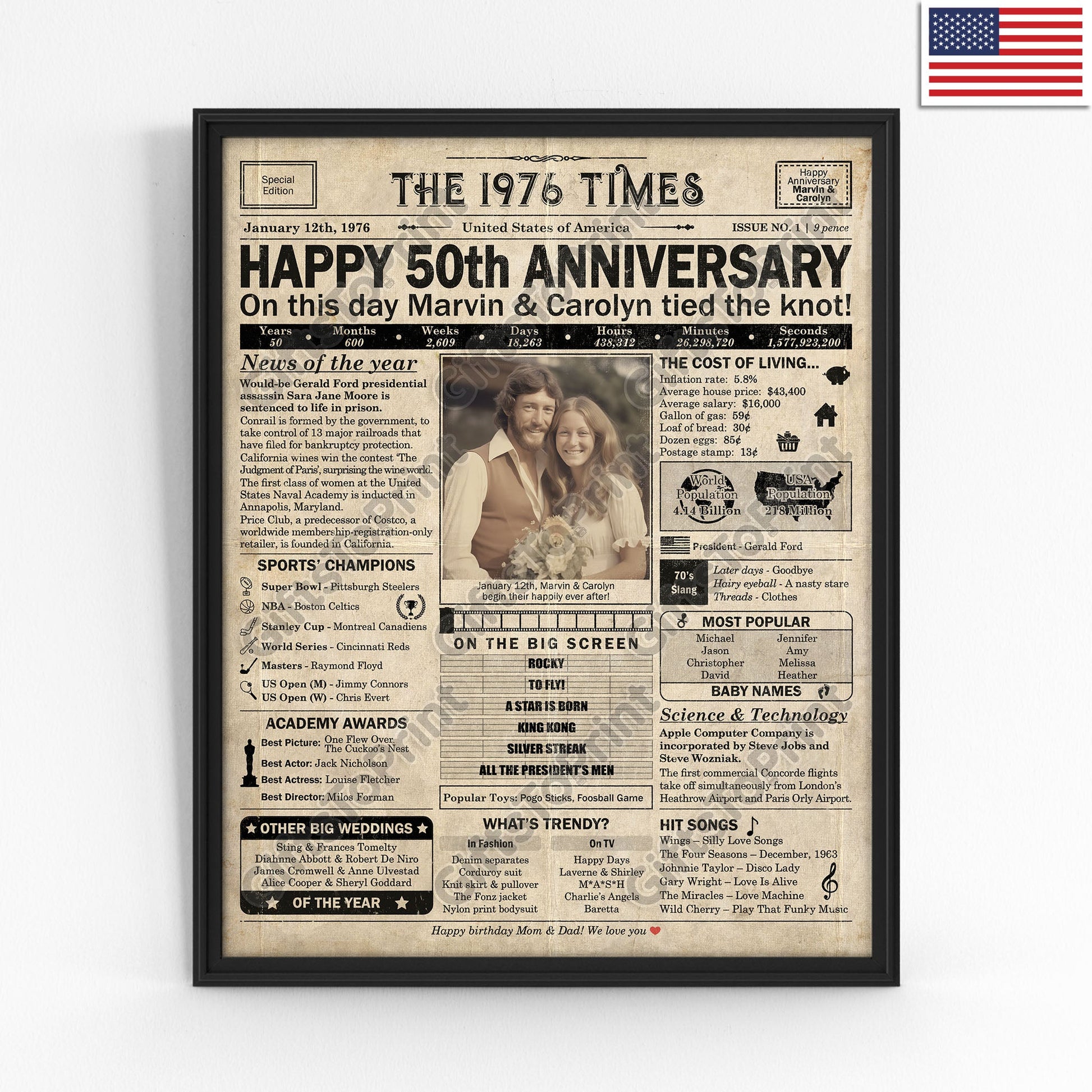 50th Anniversary – US Version. A printable, personalized anniversary poster with news, fun facts, and highlights of what happened in 1976, finished as a realistic, aged newspaper look. Add a photo, names, wedding date, and even a special message for the bottom of the "newspaper" to give it a personal touch. It makes a beautiful keepsake gift when printed and framed.