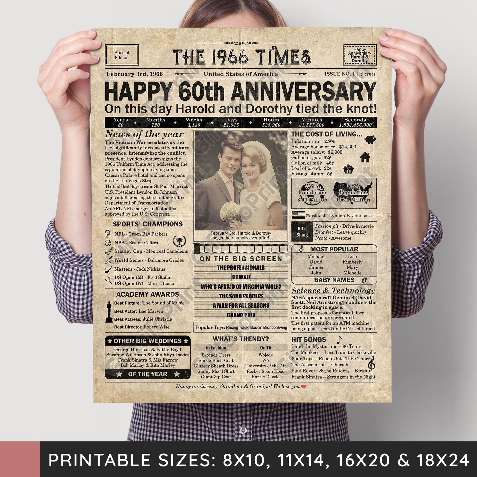60th Anniversary – US Version. A printable, personalized anniversary poster with news, fun facts, and highlights of what happened in 1966, finished as a realistic, aged newspaper look. Add a photo, names, wedding date, and even a special message for the bottom of the "newspaper" to give it a personal touch. It makes a beautiful keepsake gift when printed and framed.