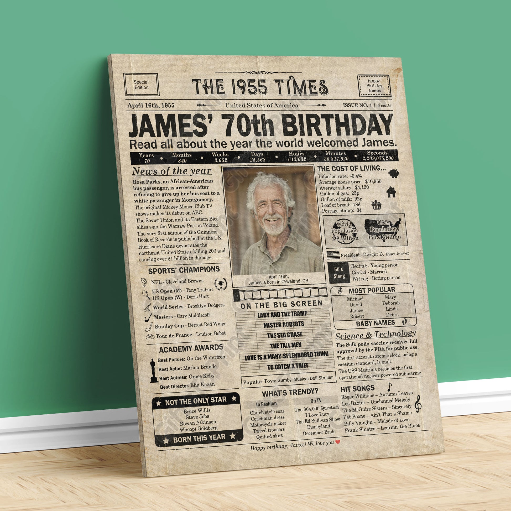 70th Birthday – US Version. A printable, personalized birthday poster with news, fun facts, and highlights of what happened in 1955, finished as a realistic, aged newspaper look. Add a photo, name, date of birth, place of birth and even a special message for the bottom of the "newspaper" to give it a personal touch. It makes a beautiful keepsake gift when printed and framed.