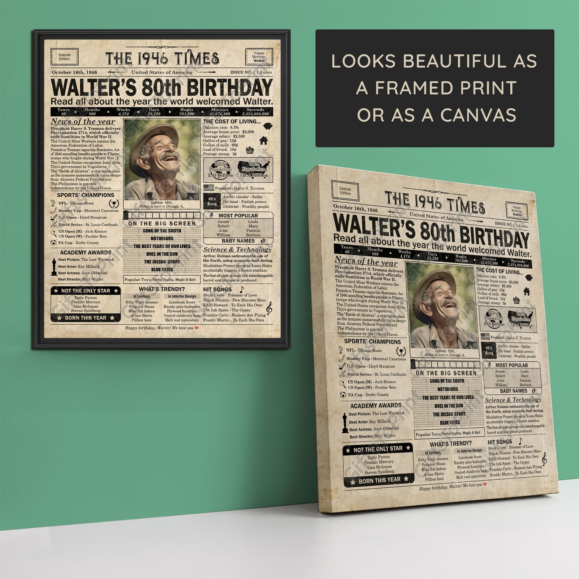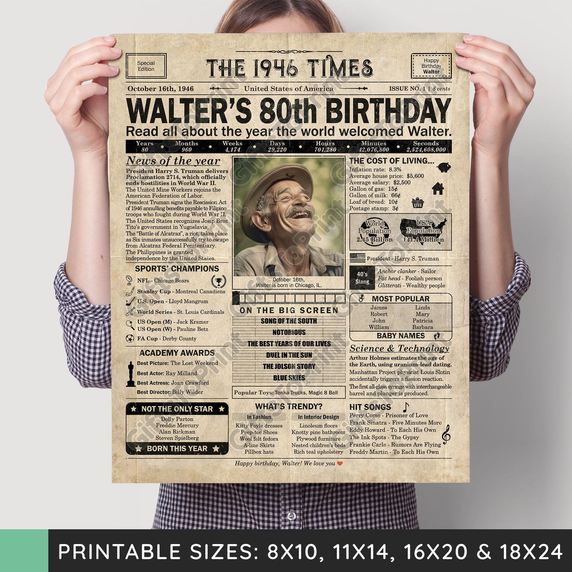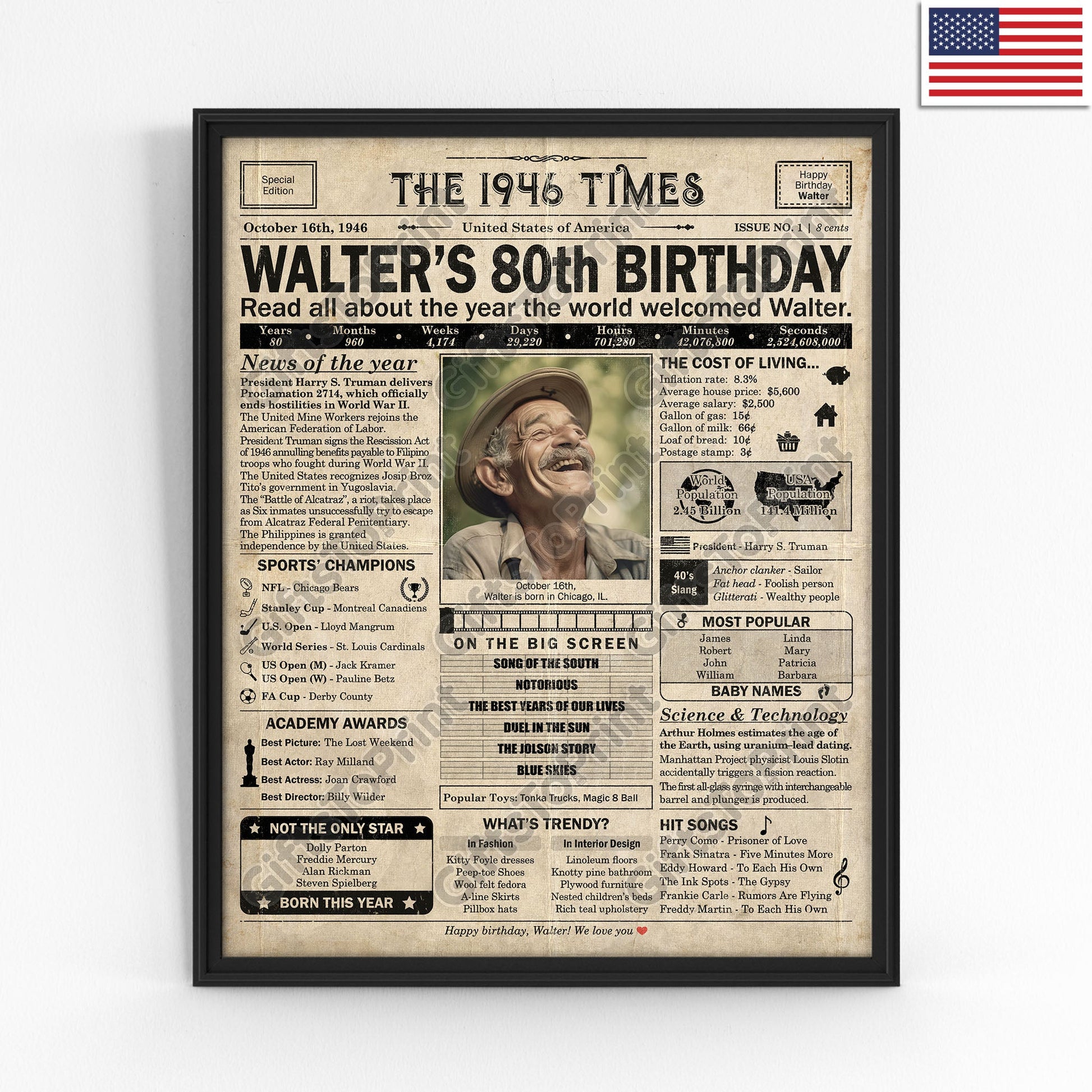 80th Birthday – US Version. A printable, personalized birthday poster with news, fun facts, and highlights of what happened in 1946, finished as a realistic, aged newspaper look. Add a photo, name, date of birth, place of birth and even a special message for the bottom of the "newspaper" to give it a personal touch. It makes a beautiful keepsake gift when printed and framed.